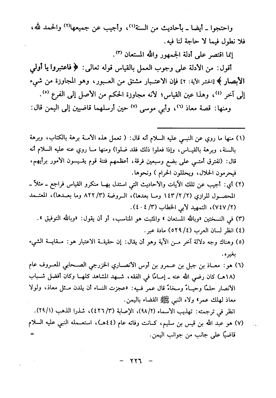إِنَّمَا اقْتصر على أَدِلَّة الْجُمْهُور وَالله الْمُسْتَعَان. أَقُول: من الْأَدِلَّة على وجوب الْعَمَل بِالْقِيَاسِ قَوْله تَعَالَى {فاعتبروا يَا أولي الْأَبْصَار} [الْحَشْر الْآيَة: 2] فَإِن الِاعْتِبَار مُشْتَقّ من العبور، وَهُوَ الْمُجَاوزَة من شَيْء إِلَى آخر، وَهَذَا عين الْقيَاس؛ لِأَنَّهُ مُجَاوزَة الحكم من الأَصْل إِلَى الْفَرْع.