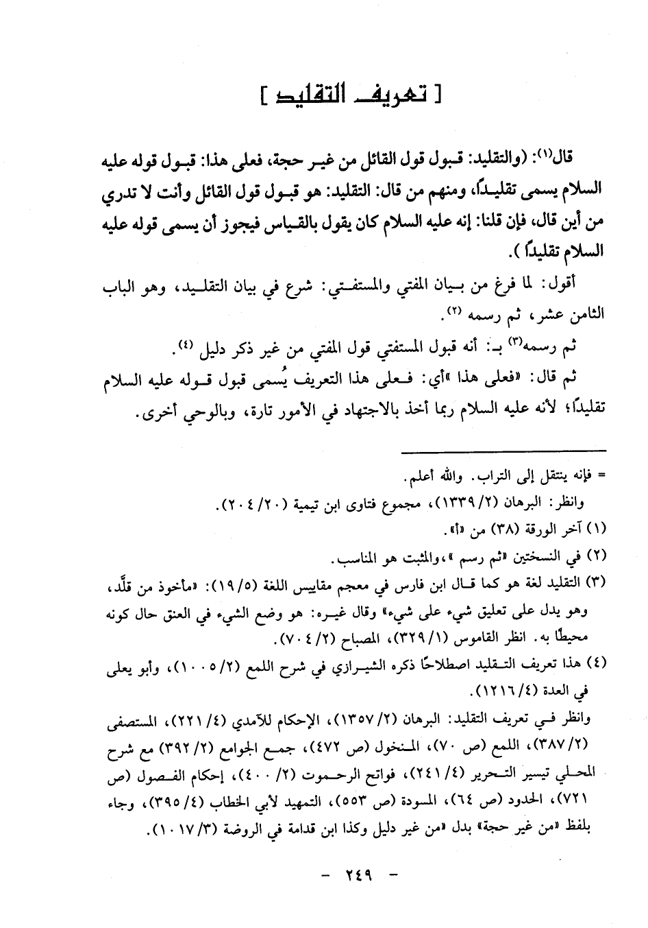 قَالَ: (والتقليد: قبُول قَول الْقَائِل من غير حجَّة، فعلى هَذَا: قبُول قَوْله عَلَيْهِ السَّلَام يُسمى تقليداً، وَمِنْهُم من قَالَ: التَّقْلِيد: هُوَ قبُول قَول الْقَائِل وَأَنت لَا تَدْرِي من أَيْن قَالَ، فَإِن قُلْنَا: إِنَّه عَلَيْهِ السَّلَام كَانَ يَقُول بِالْقِيَاسِ فَيجوز أَن يُسمى قَوْله عَلَيْهِ السَّلَام تقليداً) .