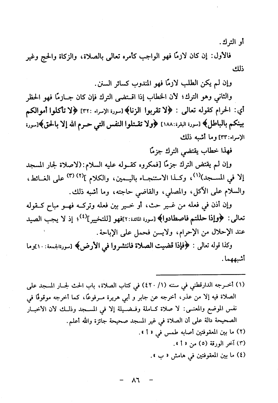 وَالثَّانِي وَهُوَ التّرْك؛ لِأَن الْخطاب إِذا اقْتضى التّرْك فَإِن كَانَ جَازِمًا فَهُوَ الْحَظْر أَي: الْحَرَام كَقَوْلِه تَعَالَى {لَا تقربُوا الزِّنَا} [سُورَة الْإِسْرَاء: 32] {لَا تَأْكُلُوا أَمْوَالكُم بَيْنكُم بِالْبَاطِلِ} [سُورَة الْبَقَرَة: 188] {وَلَا تقتلُوا النَّفس الَّتِي حرم الله إِلَّا بِالْحَقِّ} [سُورَة الْإِسْرَاء: 33] وَمَا أشبه ذَلِك.
