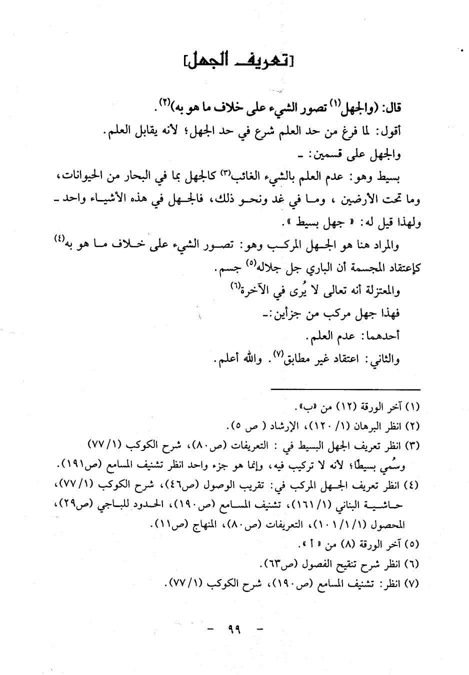 وَالْمرَاد هُنَا هُوَ الْجَهْل الْمركب وَهُوَ: تصور الشَّيْء على خلاف مَا هُوَ بِهِ كاعتقاد المجسمة أَن الْبَارِي جلّ جَلَاله جسم.