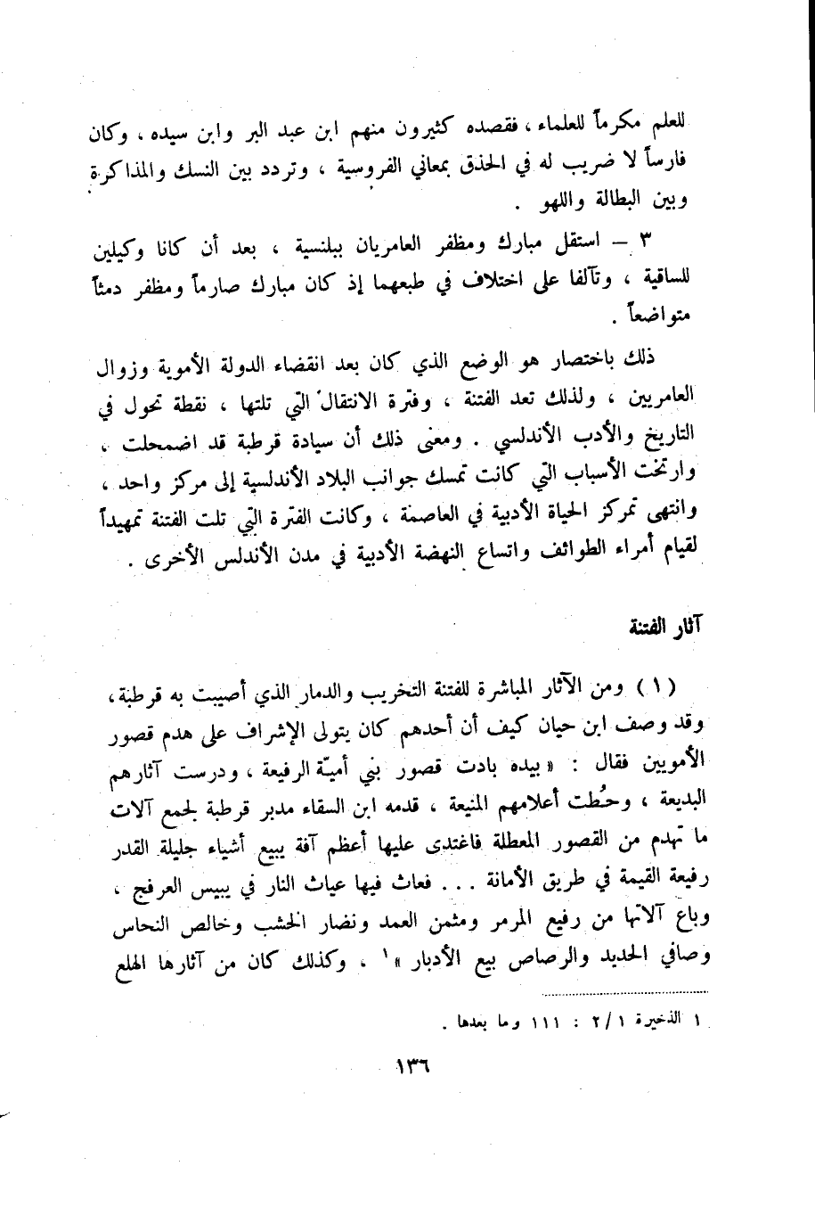 من كتب المشارقة كمصنف ابن أبي شيبة وفقه الشافعي والتاريخ لخليفة ابن جياط، والطبقات له أيضاً وكتاب سيرة عمر بن عبد العزيز للدورقي ونسخة من كتاب العين سمعها على ابن ولاد بمصر. وأما ابن وضاح فانه كان عالما بالحديث بصيرا بطرقه، متكلما على علله، وأما الخشبي فانه لقي لغويي المشرق في رحلته فأخذ عنهم كثيرا من كتب اللغة، رواية الأصمعي، ودخل بغداد وكتب بها كتب أبي عبيد القاسم بن سلام، وأدخل الأندلس كثيرا من حديث الأئمة وكثيرا من اللغة والشعر الجاهلي رواية. فالثقافة التي تلقاها ابن عبد ربه عن هؤلاء الأعلام تشمل الفقه والحديث واللغة والسير والأخبار. ومعرض هذه الثقافة كتاب " العقد "، لأن فيه نقولا من كتب المشارقة وفي رأسها كتب ابن قتيبة وكتب ابن سلام وبخاصة كتاب " الأمثال " فانه قد اقتبسه في كتاب العقد، بشيء من الاختصار، هذا عدا اطلاعه الواسع على دواوين شعراء المشرق ومؤلفات اللغويين. ولهذه الثقافة أثرها في شهره، كما سأبين من بعد.