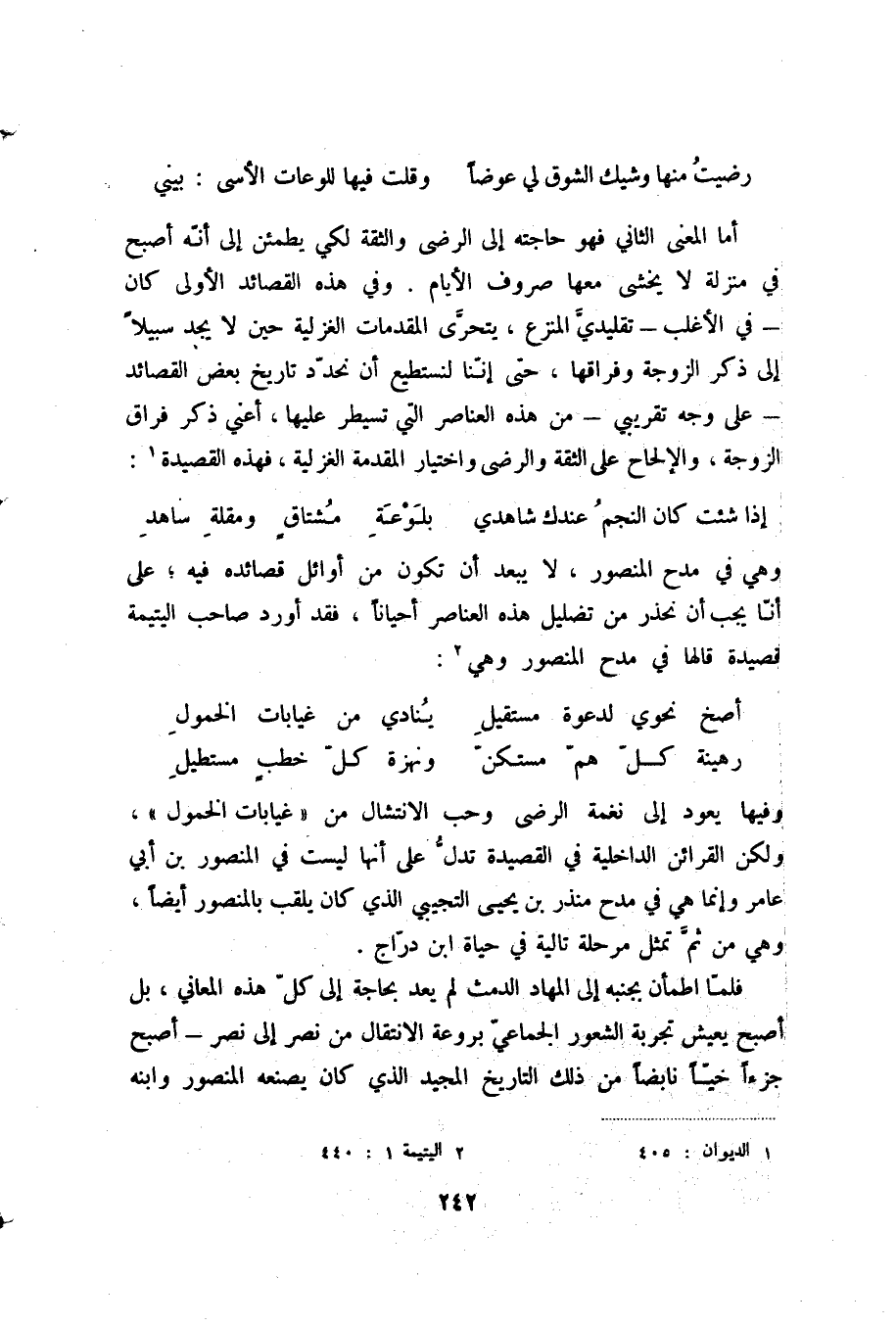 فسألناه: أبن ذاك لنا ... قال: هل يخفى ضياء الكوكب؟ وأكثر شغفه بالصور السابحة المعتلية عن مستوى الأرض المقترنة بالجو أو بالنجوم أو بالطيور أو بظهور الخيل، وهو يتصور نفسه على ارتفاع، ومرد هذا كله إلى شعوره بالاستعلاء بالنسبة لمن حوله، والى خوفه من الموت، حتى انه حين تصور قدوم الموت تمنى قائلا: