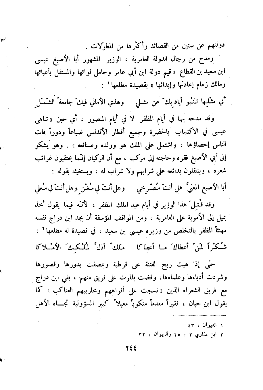 فبكيت من زمن قطعت مراحلا ... وشبيبه أخلقت من ريعانها وابن شهيد غير مقصر في موضوعات لمدح والرثاء متفوق في الأوصاف والخمريات والمجونيات والاهاجي، إلا انه يفتقد العمق الذي تجده عند الغزال كما انه من الغموض العسر الذي شاب أشعار ابن دراج، وتفوق في الحدة والاندفاع في الشعر على كل من سبقه من شعراء الأندلس. وقد عابه معاصروه بشيئين: الانتحال والتطويل، وكان هذان الاثنان بالمعنى الذي يفهمه ابن شهيد من مصادر تفوقه.