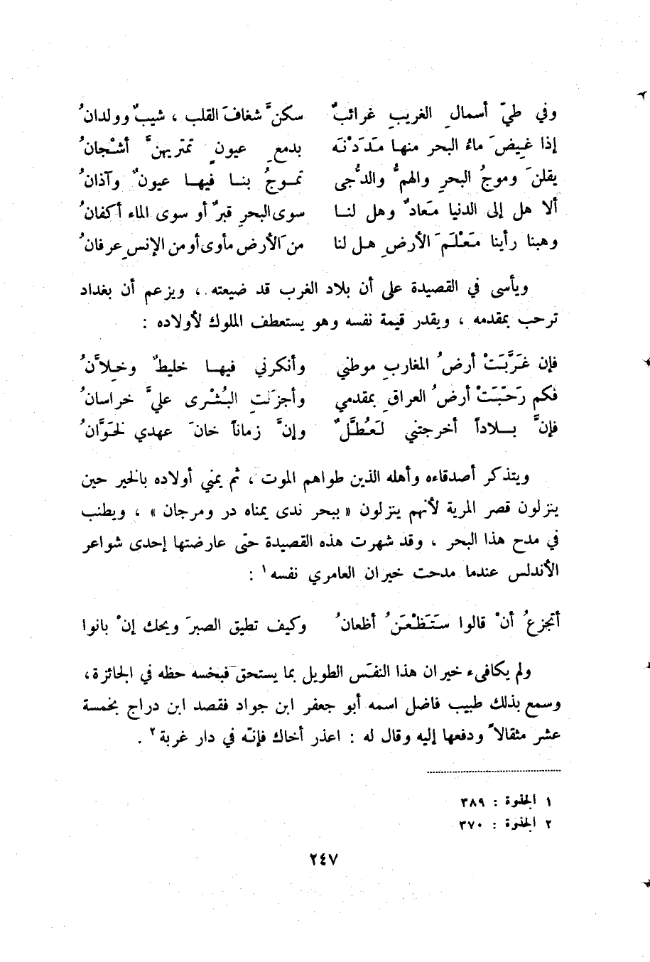 راسخة في الإسلام، أما الأول فيقصر علاقته بالإسلام على جده الأدنى، أو والد جده؟ على الأكثر -. وقد مال لهذا الرأي عدد من الباحثين لأنه يصل ابن حزم بالمسيحية أو بالأسبانية عموما، رغبة منهم في ان يدرسوه على ضوء الوراثة القريبة، ولكني أميل إلى ترجيح النسبة الفارسية، لأن اتهام ابن حزم في نسبه الفارسي إنما صدر عن رجل ميال للذم والثلب، هو ابن حيان المؤرخ، ولا يبعد أن يكون انعدام السابقة والأولية قبل صعود نجم احمد بن سعيد والد أبي محمد، هو الذي أوحى بهذا الاعتقاد، ثم ان ابن حزم أتقى لله من ان يلفق لنفسه نسبا غير نسبه، وليست وراء هذا التلفيق غاية كبيرة لرجل يرى ان الناس يتفاضلون بأعمالهم لا بأنسابهم. وقد نسب نفسه إلى الولاء، وكان هو وأبوه كلاهما ميالا لبني أمية في عهد العامريين، ولم يكن هذا الميل ليكسب لهم رضى العامريين، ولا بد ان يكون في صدق الولاء القديم ما يدفعهما إلى مثل ذلك، وقد دهش ابن حيان نفسه من هذه الموالاة، كما دهش من ان يكون ابن حزم مدعيا في نفسه، إذ لا يعرف عليه خطل أو جهالة.