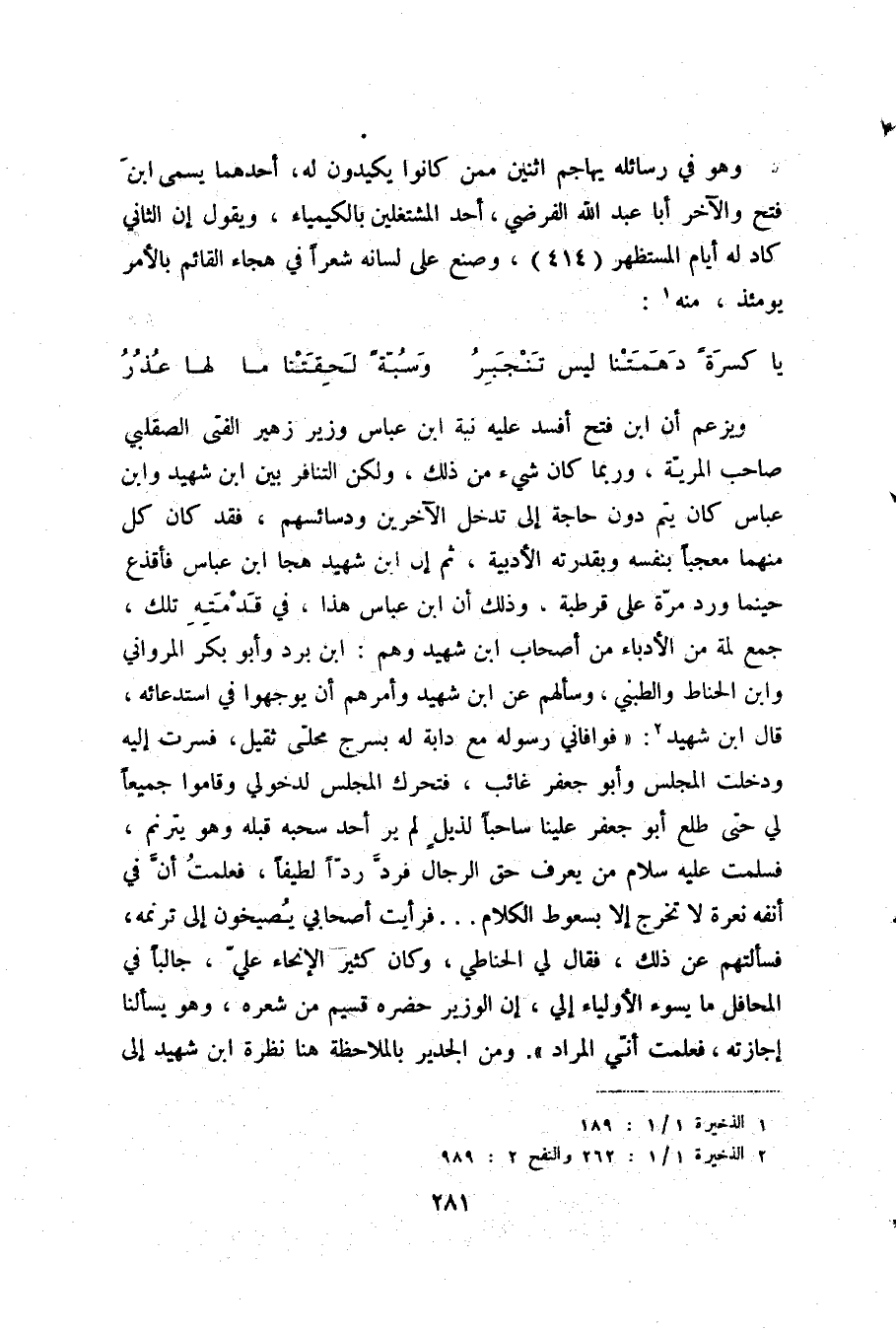 سموت إليها بعد ما نام أهلها ... سمو حباب الماء حالا على حال وكيف حاول عمر بن أبي ربيعة فأخفق، وهنا يستمع ابن شهيد إلى نصيحة غالية تقول: " إذا اعتمدت معنى قد سبقك إليه غيرك فأحسن تركيبه وأرق حاشيته فاضرب عنه جملة وان لم يكن بد ففي غير العروض التي تقدم إليها ذلك المحسن لتنشط طبيعتك وتقوى منتك ". ثم يقدم لنا نماذج من شعره جاذب بها المتنبي وهو معجب بكل ما صنع، ويسمعه شخص آخر من الجن فيسأله محقرا: " على من أخذت هذا الزمير؟ " ويتحداه بأمثلة أخرى من شعر أبي الطيب فيرد عليه ابن شهيد بقصائد له معارضا فإذا عرف الجني انه من أسرة أكثرها شعراء حلف ان لا يعرض له ابدا، وقل واضمحل. أما هذا الجني فاسمه فرعون بن الجون وهو تابع رجل كبير في قرطبة. وعند هذه المرحلة يبلغ إعجاب الشهيدي بنفسه ذروته، فمن قبل كان تلميذا للمتنبي يتهيب الإنشاد بين يديه، أما وقد غاب المتنبي فلم يعجبه ان يتعصب أحد من أهل بلده للمتنبي ويفضله عليه بل يرى في نفسه شاعرا لا يقع دون أبي الطيب في احسن معانيه وأسيرها. وإذا كان الشعر هو إجادة المعارضة وإجادة الأخذ فقد حاز ابن شهيد في المرتين قصب السبق، وظن أن ذلك يغنيه عن الإطالة بل ظن ان طريقه تلك هي الأصالة عينها، وبذلك ينتهي القسم الثاني.