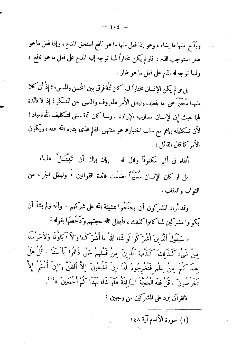 بل لو لم يكن الإنسان مختارًا لَمَا كان ثمّة فرق بين المحسن والمسىء, إذ أن كلاً منهما مُجْبر على ما يفعله؛ ولبطل الأمر بالمعروف والنهى عن المنكر, إذ لا فائدة لهما, حيث إن الإنسان مسلوب الإرادة؛ ولَمَا كان ثمّة معنى لتكليف الله للعباد, لأن تكليفه إياهم مع سلب اختيارهم هو منتهى الظلم الذى يتنزه الله عنه, ويكون الأمر كما قال القائل: