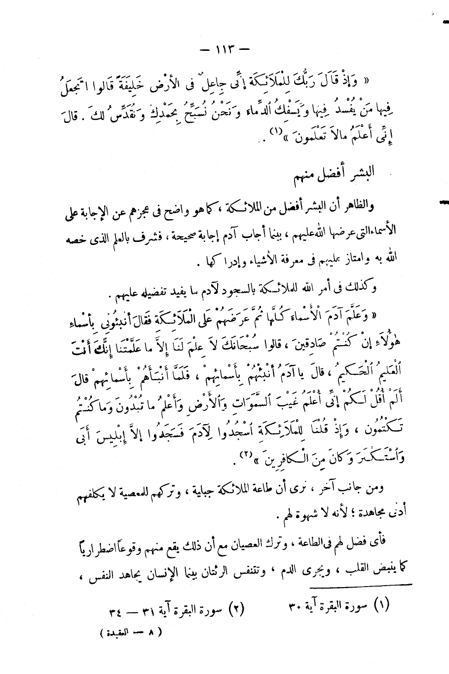{وَعَلَّمَ آدَمَ الأَسْمَاءَ كُلَّهَا ثُمَّ عَرَضَهُمْ عَلَى الْمَلائِكَةِ فَقَالَ أَنْبِئُونِي بِأَسْمَاءِ هَؤُلاءِ إِنْ كُنْتُمْ صَادِقِينَ * قَالُوا سُبْحَانَكَ لا عِلْمَ لَنَا إِلاَّ مَا عَلَّمْتَنَا إِنَّكَ أَنْتَ الْعَلِيمُ الْحَكِيمُ * قَالَ يَا آدَمُ أَنْبِئْهُمْ بِأَسْمَائِهِمْ فَلَمَّا أَنْبَأَهُمْ بِأَسْمَائِهِمْ قَالَ أَلَمْ أَقُلْ لَكُمْ إِنِّي أَعْلَمُ غَيْبَ السَّمَاوَاتِ وَالأَرْضِ وَأَعْلَمُ مَا تُبْدُونَ وَمَا كُنْتُمْ تَكْتُمُونَ * وَإِذْ قُلْنَا لِلْمَلائِكَةِ اسْجُدُوا لآدَمَ فَسَجَدُوا إِلاَّ إِبْلِيسَ أَبَى وَاسْتَكْبَرَ وَكَانَ مِنَ الْكَافِرِينَ} (¬2).
