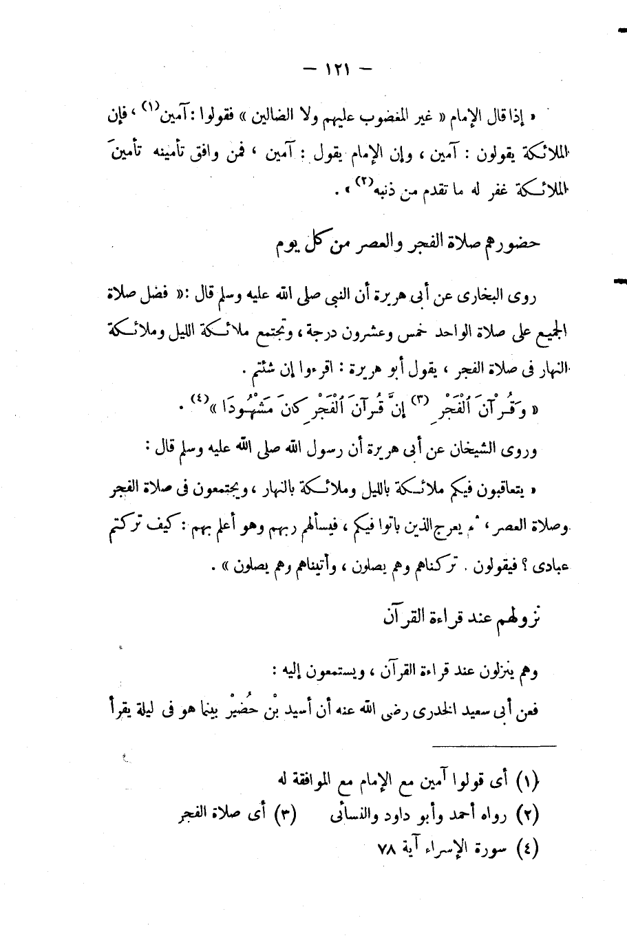 وروى الشيخان عن أبى هريرة رضى الله عنه أن رسول الله صلى الله علية وسلم قال: «يتعاقبون فيكم ملائكة بالليل وملائكة بالنهار، ويجتمعون فى صلاة الفجر وصلاة العصر، ثم يعرج الذين باتوا فيكم، فيسـ ألهم ربهم وهو أعلم بهم: كيف تركتم عبادى؟ فيقولون: تركناهم وهم يصلون، وأتيناهم وهم يصلون» (¬7).