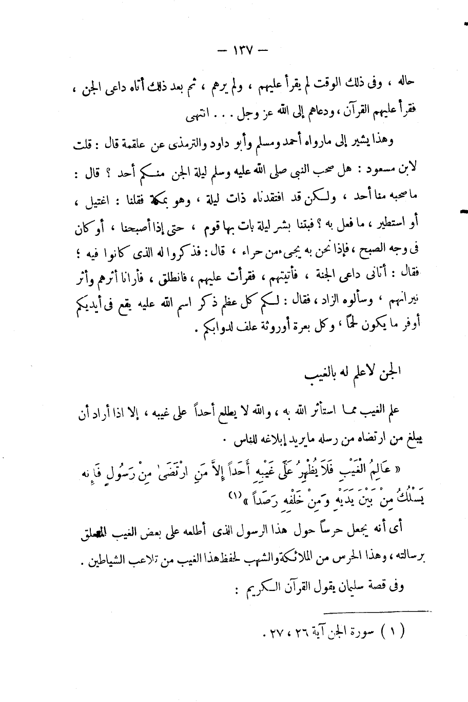 وهذا يشير إلى ما رواه أحمد ومسلم وأبو داود والترمذى عن علقمة قال: قلت لابن مسعود: هل صحب النبى ليلة الجن منكم أحد؟ قال: ما صحبه منا أحد، ولكن قد افتقدناه ذات ليلة، وهو بمكة فقلنا: اغتيل، أو استطير، ما فعل به؟ فبتنا بشر ليلة بات بها قوم، حتى إذا أصبحنا، أو كان فى وجه الصبح، فإذا نحن به يجىء من حراء، قال: فذكروا له الذى كانوا فيه، فقال: أتانى داعى الجنة، فأتيتهم، فقرأت عليهم، فانطلق، فأرانا أثرهم وأثر نيرانهم، وسألوه الزاد، فقال: لكم كل عظم ذكر اسم الله عليه يقع فى أيديكم أوفر ما يكون لحمًا، وكل بعرة أو روثة علف لدوابكم.