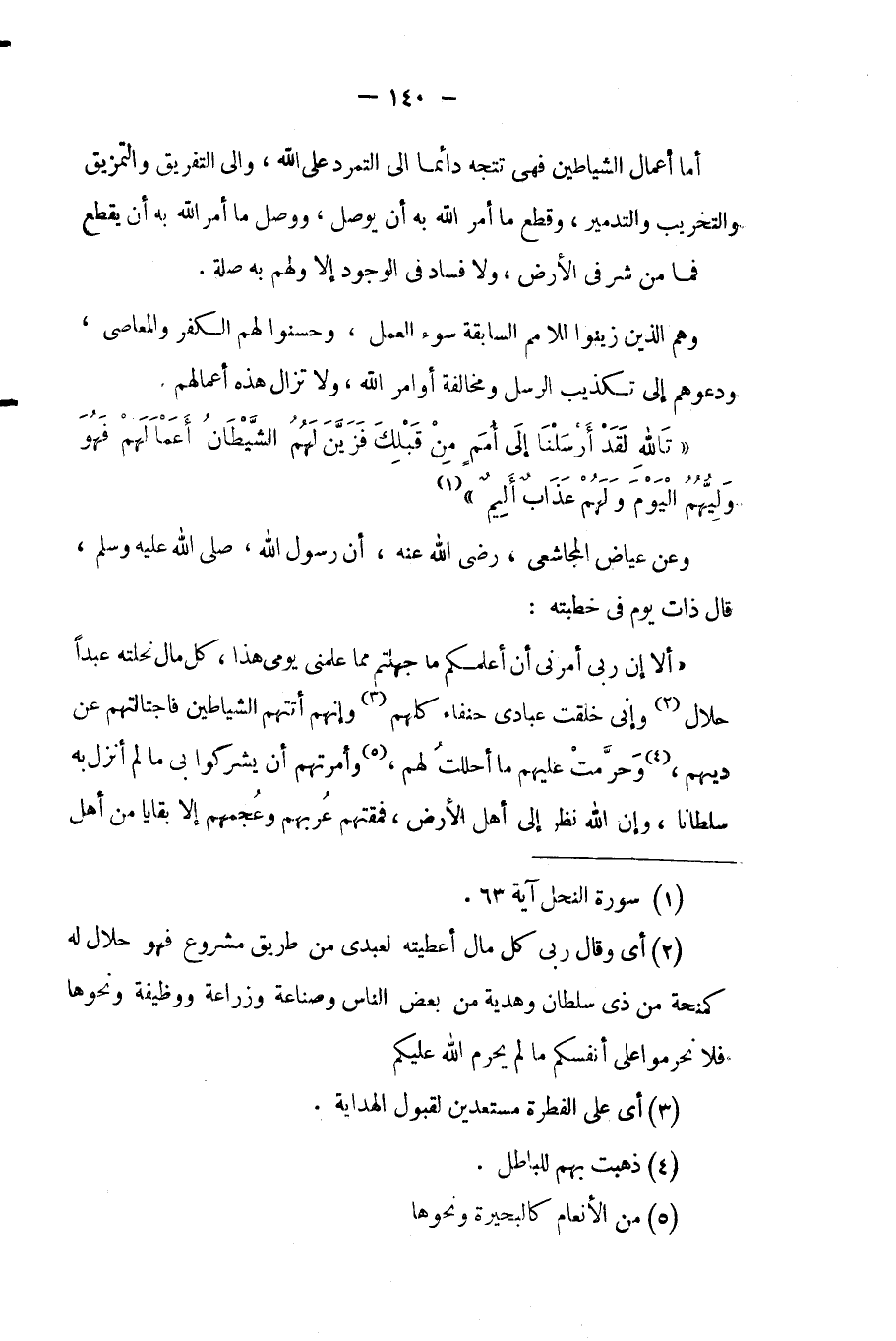 وعن عياض المجاشعى رضي الله عنه أن رسول الله صلى الله عليه وسلم قال ذات يوم فى خطبته: «أَلاَ إِنَّ رَبِّى أَمَرَنِى أَنْ أُعَلِّمَكُمْ مَا جَهِلْتُمْ مِمَّا عَلَّمَنِى يَوْمِى هَذَا، كُلُّ مَالٍ نَحَلْتُهُ عَبْداً حَلاَلٌ (¬2)، وَإِنِّى خَلَقْتُ عِبَادِى حُنَفَاءَ كُلَّهُمْ (¬3)، وَإِنَّهُمْ أَتَتْهُمُ الشَّيَاطِينُ فَاجْتَالَتْهُمْ عَنْ دِينِهِمْ (¬4)، وَحَرَّمَتْ عَلَيْهِمْ مَا أَحْلَلْتُ لَهُمْ (¬5)، وَأَمَرَتْهُمْ أَنْ يُشْرِكُوا بِى مَا لَمْ أُنْزِلْ بِهِ سُلْطَاناً، وَإِنَّ اللَّهَ نَظَرَ إِلَى أَهْلِ الأَرْضِ فَمَقَتَهُمْ عَرَبَهُمْ وَعَجَمَهُمْ إِلاَّ بَقَايَا مِنْ أَهْلِ