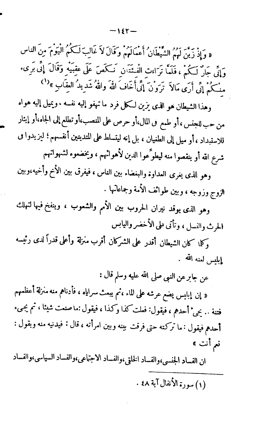 وهذا الشيطان هو الذى يزين لكل فرد ما تهفوا إليه نفسه، ويميل إليه هواه من حب للجنس، أو طمع فى المال، أو حرص على المنصب، أو تطلع إلى الجاه، أو إيثار للاستبداد، أو ميل إلى الطغيان .. بل إنه ليتسلط على المتدينين أنفسهم، ليزيدوا فى شرع الله، أو ينقصوا منه، ليطوِّعوا الدين لأهوائهم، ويخضعوه لشهواتهم.