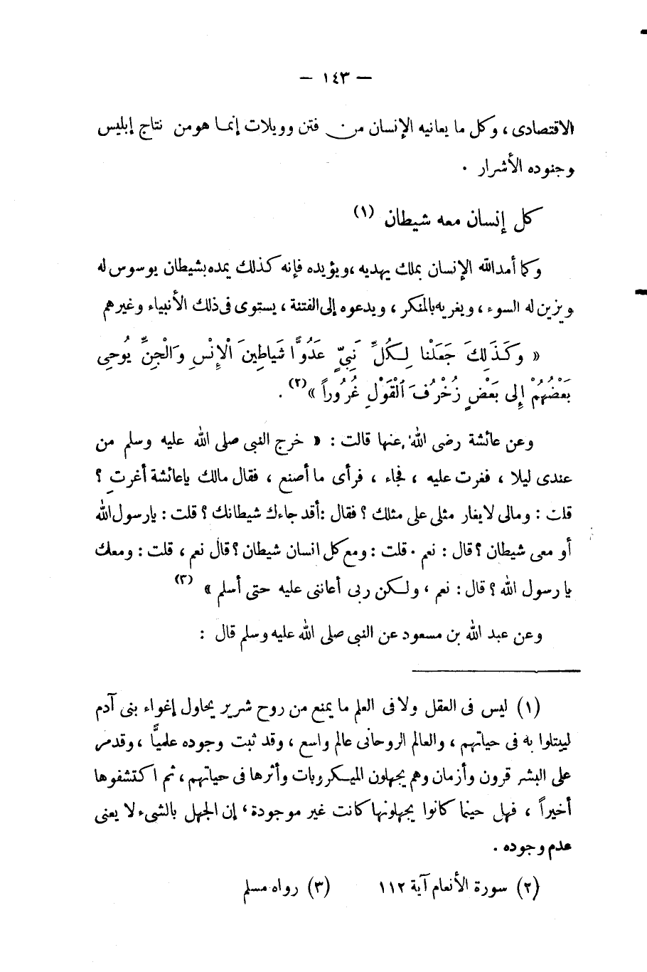 (¬1) ليس فى العقل، ولا فى العلم، ما يمنع من روح شرير يحاول إغواء بنى آدم ليبتلوا به فى حياتهم، والعالم الروحانى عالم واسع، وقد ثبت وجوده علميًا، وقد مر على البشر قرون وأزمان وهم يجهلون الميكروبات وأثرها فى حياتهم، ثم اكتشفوها أخيرًا، فهل حينما كانوا يجهلونها كانت غير موجودة؟! إن الجهل بالشىء لا يعنى عدم وجوده.
