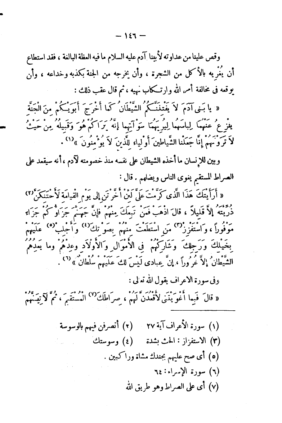 {أَرَأَيْتَكَ هَذَا الَّذِي كَرَّمْتَ عَلَيَّ لَئِنْ أَخَّرْتَنِ إِلَى يَوْمِ الْقِيَامَةِ (¬2) لأَحْتَنِكَنَّ ذُرِّيَّتَهُ إِلاَّ قَلِيلاً * قَالَ اذْهَبْ فَمَنْ تَبِعَكَ مِنْهُمْ فَإِنَّ جَهَنَّمَ جَزَاؤُكُمْ جَزَاءً مَوْفُوراً * وَاسْتَفْزِزْ (¬3) مَنِ اسْتَطَعْتَ مِنْهُمْ بِصَوْتِكَ (¬4) وَأَجْلِبْ (¬5) عَلَيْهِمْ بِخَيْلِكَ وَرَجِلِكَ وَشَارِكْهُمْ فِي الأَمْوَالِ وَالأَوْلادِ وَعِدْهُمْ وَمَا يَعِدُهُمُ الشَّيْطَانُ إِلاَّ غُرُوراً * إِنَّ عِبَادِي لَيْسَ لَكَ عَلَيْهِمْ سُلْطَانٌ} (¬6).