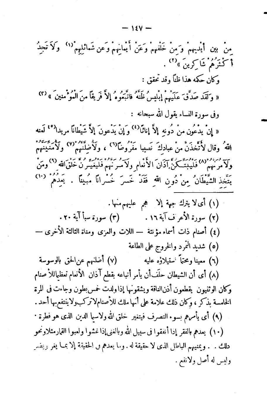 إِنْ يَدْعُونَ مِنْ دُونِهِ إِلاَّ إِنَاثاً (¬4) وَإِنْ يَدْعُونَ إِلاَّ شَيْطَاناً مَرِيداً (¬5) *لَعَنَهُ اللَّهُ وَقَالَ لأَتَّخِذَنَّ مِنْ عِبَادِكَ نَصِيباً مَفْرُوضاً (¬6) * وَلأُضِلَّنَّهُمْ (¬7) وَلأُمَنِّيَنَّهُمْ وَلآمُرَنَّهُمْ (¬8) فَلَيُبَتِّكُنَّ آذَانَ الأَنْعَامِ وَلآمُرَنَّهُمْ فَلَيُغَيِّرُنَّ خَلْقَ اللَّهِ (¬9) وَمَنْ يَتَّخِذِ الشَّيْطَانَ وَلِيّاً مِنْ دُونِ اللَّهِ فَقَدْ خَسِرَ خُسْرَاناً مُبِيناً * يَعِدُهُمْ (¬10)