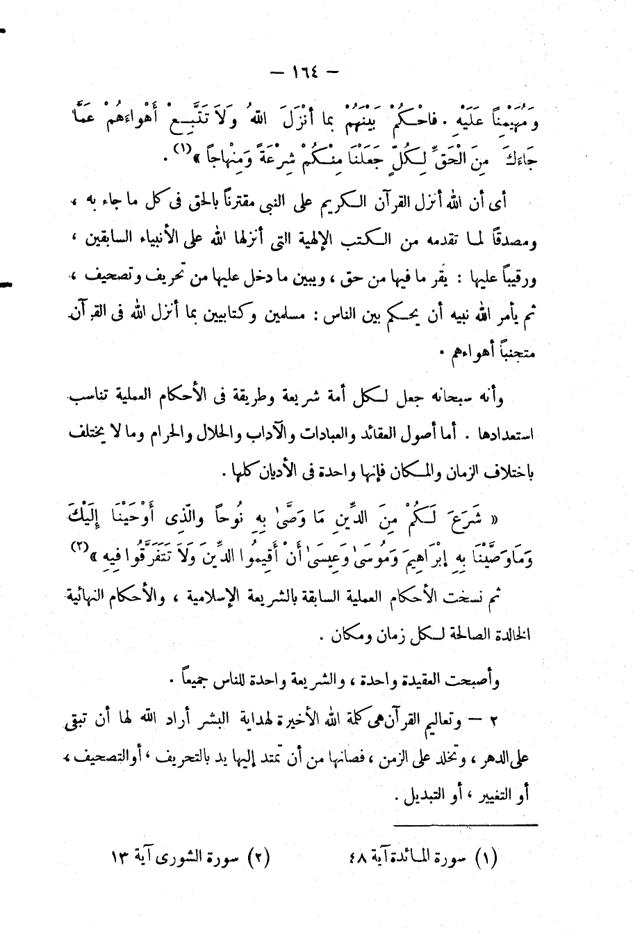 وَمُهَيْمِناً عَلَيْهِ فَاحْكُمْ بَيْنَهُمْ بِمَا أَنْزَلَ اللَّهُ وَلا تَتَّبِعْ أَهْوَاءَهُمْ عَمَّا جَاءَكَ مِنَ الْحَقِّ لِكُلٍّ جَعَلْنَا مِنْكُمْ شِرْعَةً وَمِنْهَاجاً} (¬1).