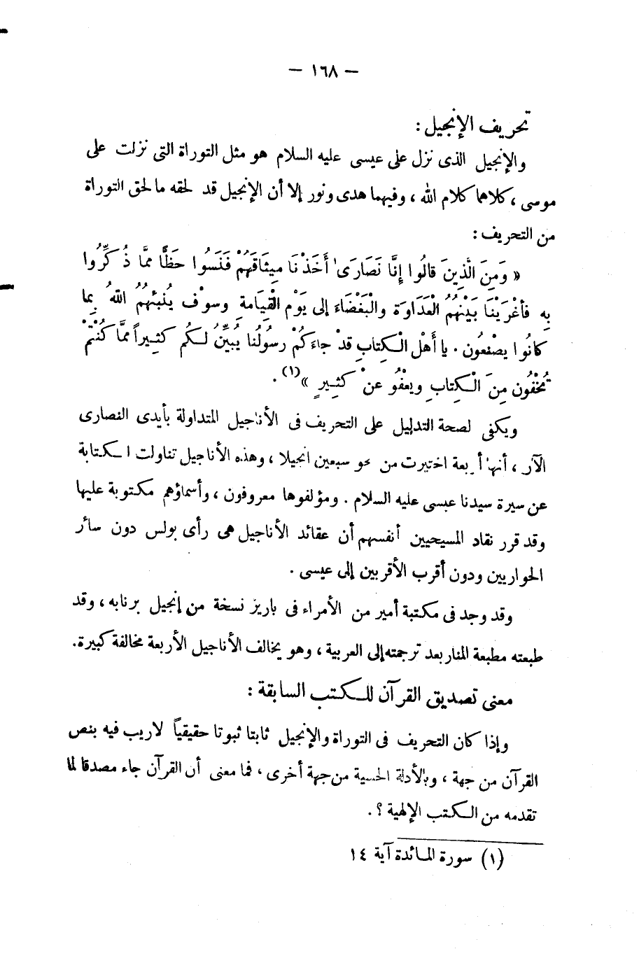 ويكفى لصحة التدليل على التحريف فى الأناجيل المتداولة بأيدى النصارى الآن، أنها أربعة اختيرت من نحو سبعين إنجيلاً، وهذه الأناجيل تناولت الكتابة عن سيرة سيدنا عيسى عليه السلام، ومؤلفوها معروفون، وأسماؤهم مكتوبة عليها، وقد قرر نقاد المسيحيين أنفسهم أن عقائد الأناجيل هى رأى بولس دون سائر الحواريين ودون أقرب الأقربين إلى عيسى عليه السلام.
