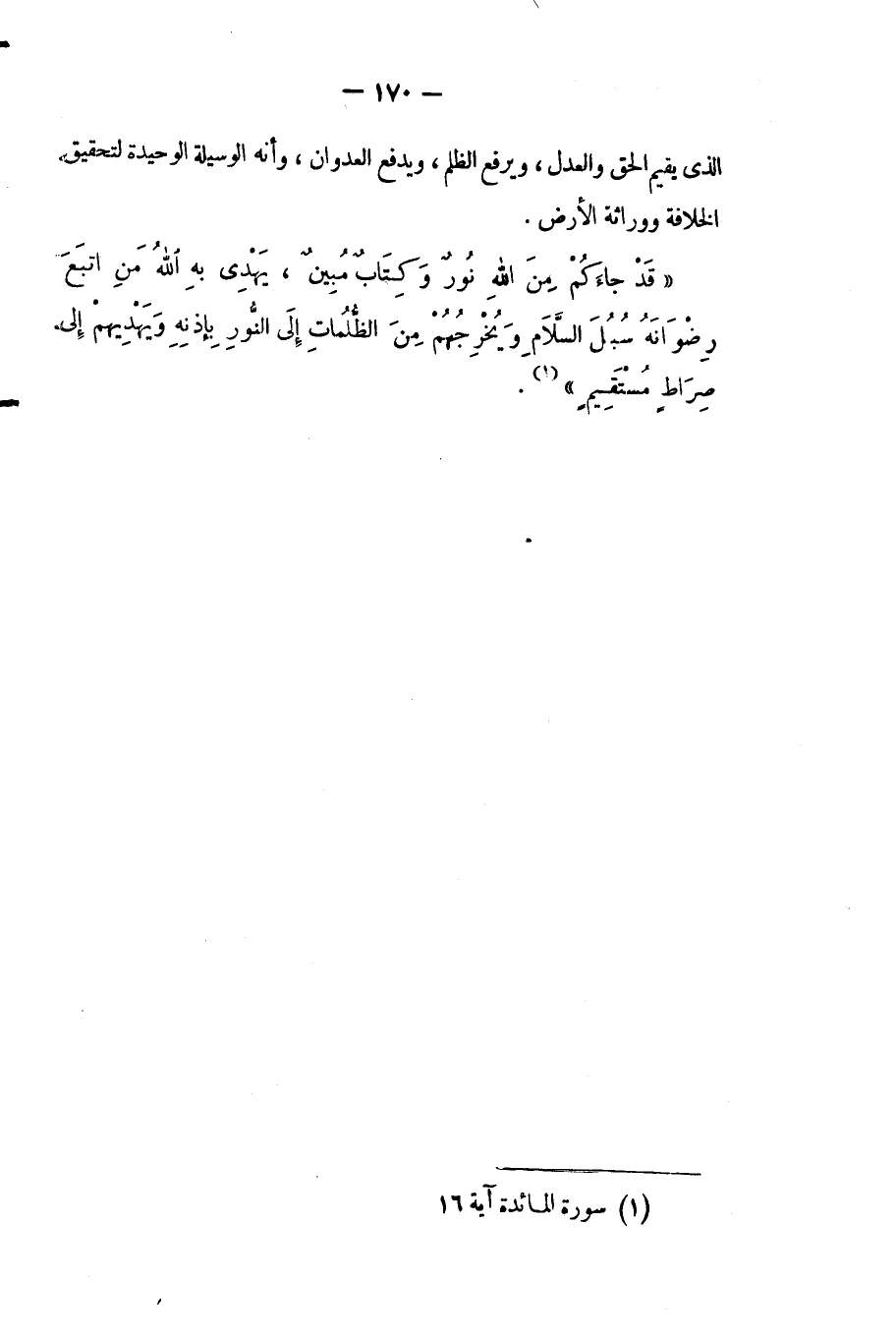 {قَدْ جَاءَكُمْ مِنَ اللَّهِ نُورٌ وَكِتَابٌ مُبِينٌ *يَهْدِي بِهِ اللَّهُ مَنِ اتَّبَعَ رِضْوَانَهُ سُبُلَ السَّلامِ وَيُخْرِجُهُمْ مِنَ الظُّلُمَاتِ إِلَى النُّورِ بِإِذْنِهِ وَيَهْدِيهِمْ إِلَى صِرَاطٍ مُسْتَقِيمٍ} (¬1).