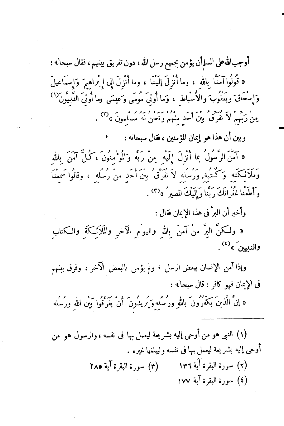 {آمَنَ الرَّسُولُ بِمَا أُنْزِلَ إِلَيْهِ مِنْ رَبِّهِ وَالْمُؤْمِنُونَ كُلٌّ آمَنَ بِاللَّهِ وَمَلائِكَتِهِ وَكُتُبِهِ وَرُسُلِهِ لا نُفَرِّقُ بَيْنَ أَحَدٍ مِنْ رُسُلِهِ وَقَالُوا سَمِعْنَا وَأَطَعْنَا غُفْرَانَكَ رَبَّنَا وَإِلَيْكَ الْمَصِيرُ} (¬3).