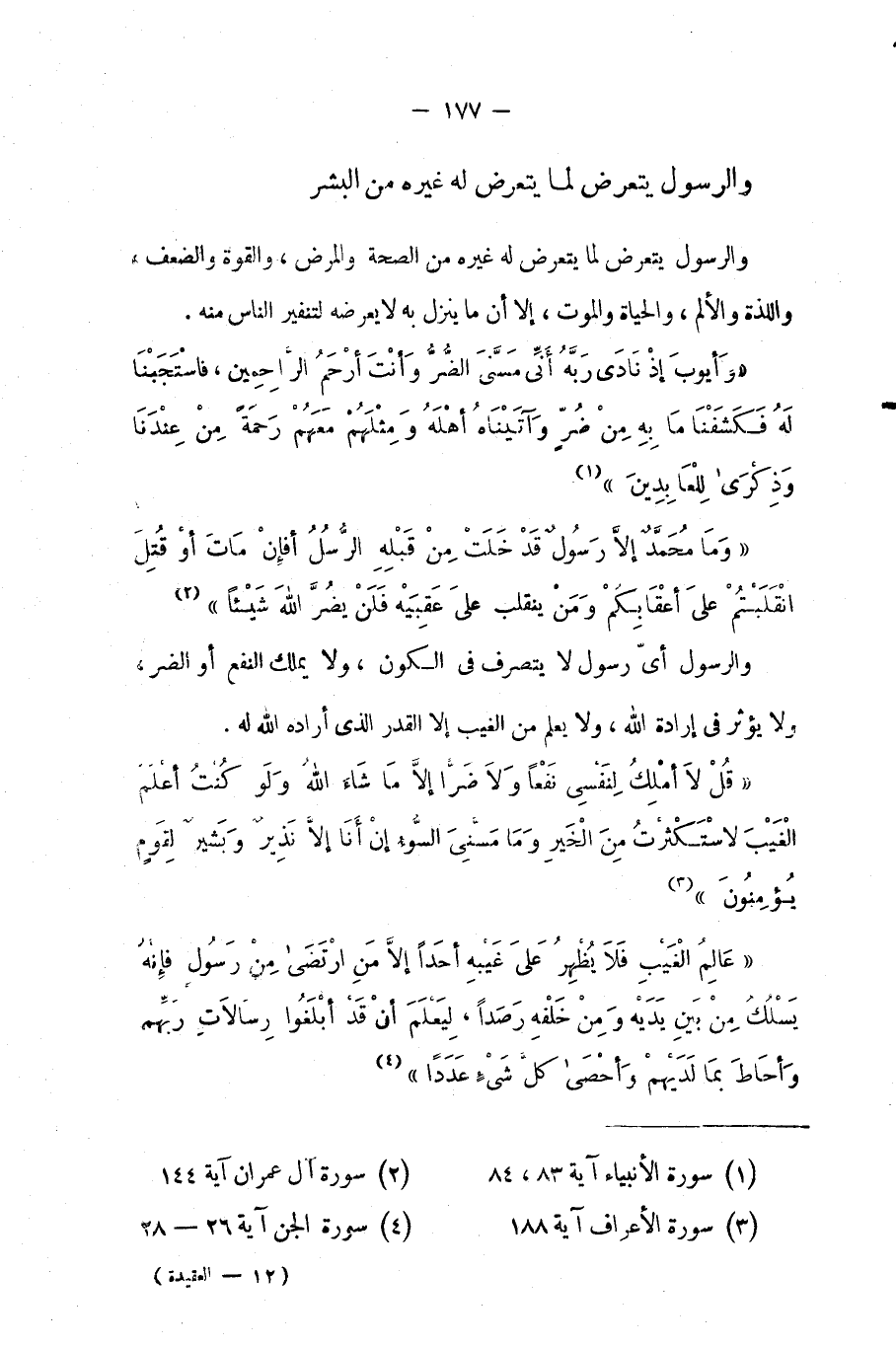 {قُلْ لا أَمْلِكُ لِنَفْسِي نَفْعاً وَلا ضَرّاً إِلاَّ مَا شَاءَ اللَّهُ وَلَوْ كُنْتُ أَعْلَمُ الْغَيْبَ لاسْتَكْثَرْتُ مِنَ الْخَيْرِ وَمَا مَسَّنِيَ السُّوءُ إِنْ أَنَا إِلاَّ نَذِيرٌ وَبَشِيرٌ لِقَوْمٍ يُؤْمِنُونَ} (¬3).