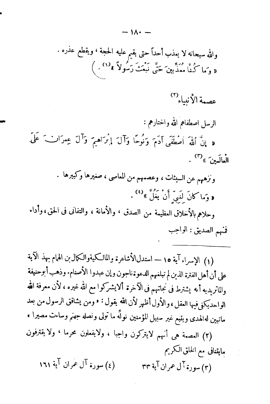 (¬1) سورة الإسراء - الآية 15 .. استدل الأشاعرة والمالكية والكمال بن الهمام بهذه الآية على أن أهل الفترة الذين لم تبلغهم الدعوة ناجون وإن عبدوا الأصنام؛ وذهب أبو حنيفة والماتريديه أنه يشترط فى نجاتهم فى الآخرة ألا يشركوا مع الله غيره، لأن معرفة الله الواحد يكفى فيها العقل .. والأول أظهر، لأن الله يقول: {وَمَنْ يُشَاقِقِ الرَّسُولَ مِنْ بَعْدِ مَا تَبَيَّنَ لَهُ الْهُدَى وَيَتَّبِعْ غَيْرَ سَبِيلِ الْمُؤْمِنِينَ نُوَلِّهِ مَا تَوَلَّى وَنُصْلِهِ جَهَنَّمَ وَسَاءَتْ مَصِيراً} " سورة النساء - الآية 115 ".