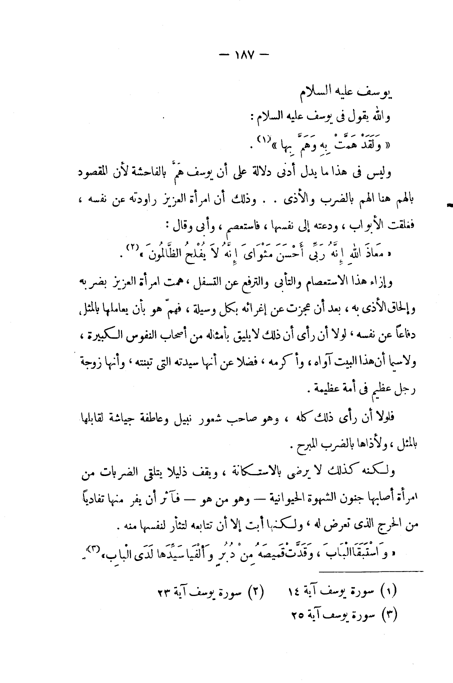 وإزاء هذا الاستعصام والتأبى والترفع عن التسفل، همت امرأة العزيز بضربه وإلحاق الأذى به، بعد أن عجزت عن إغرائه بكل وسيلة، فهَمّ هو بأن يعاملها بالمثل دفاعًا عن نفسه، لولا أن رأى أن ذلك لا يليق بأمثاله من أصحاب النفوس الكبيرة، ولاسيما أن هذا البيت أواه، وأكرمه؛ فضلاً عن أنها سيدته التى تبنته، وأنها زوجة رجل عظيم فى أمة عظيمة.