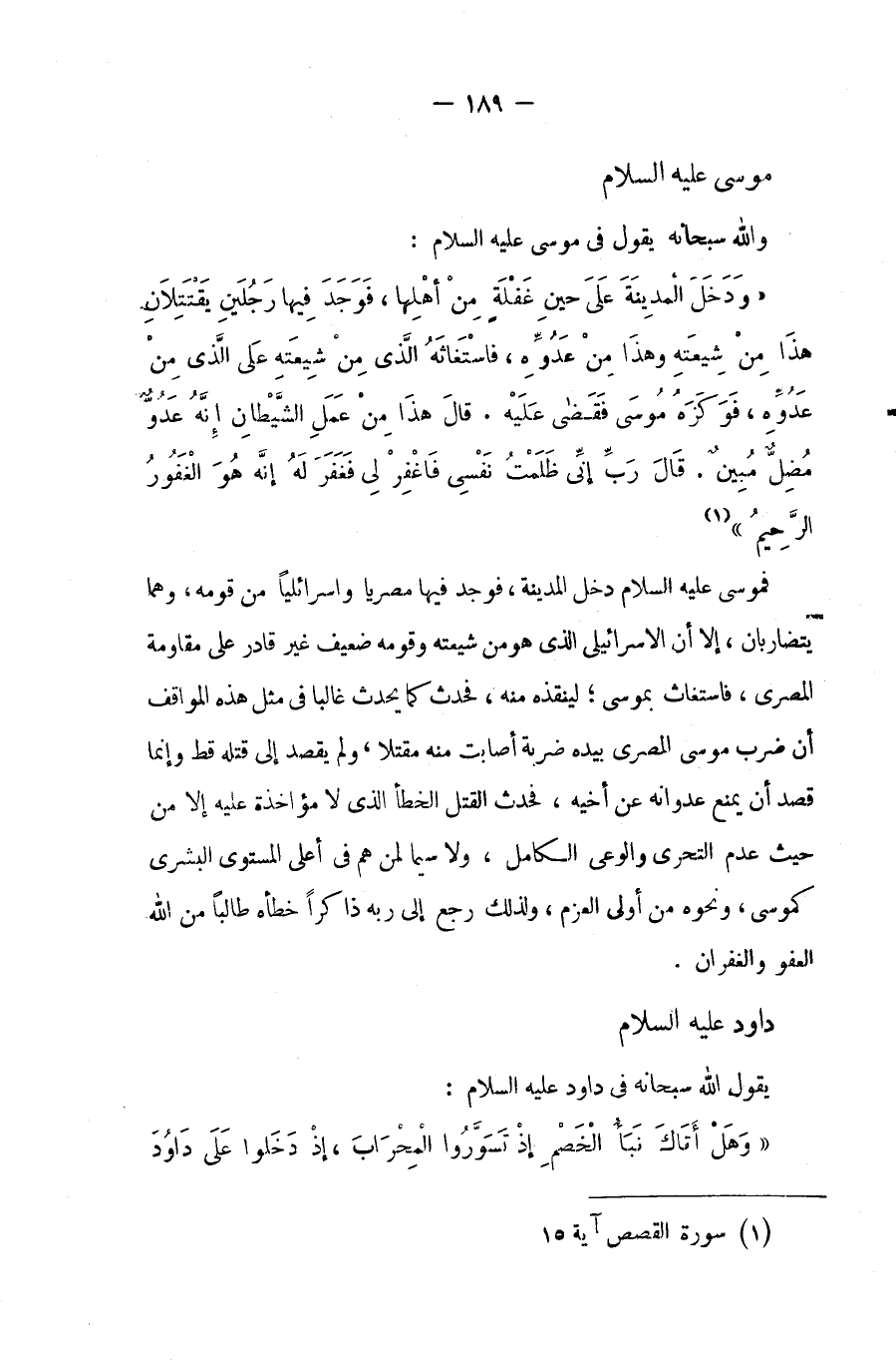فموسى عليه السلام دخل المدينة، فوجد فيها مصريًا وإسرائيليًا من قومه، وهما يتضاربان، إلا أن الإسرائيلى الذى هو من شيعته وقومه ضعيف غير قادر على مقاومة المصرى، فاستغاث بموسى، لينقذه منه، فحدث - كما يحدث غالبًا فى مثل هذه المواقف - أن ضرب موسى المصرى بيده ضربة أصابت منه مقتلاً، ولم يقصد إلى قتله قط، وإنما قصد أن يمنع عدوانه عن أخيه، فحدث القتل الخطأ الذى لا مؤاخذة عليه إلا من حيث عدم التحرى والوعى الكامل، ولاسيما لمن هم فى أعلى المستوى البشرى كـ موسى، ونحوه من أولى العزم، ولذلك رجع إلى ربه ذاكرًا خطأه طالبًا من الله العفو والغفران.