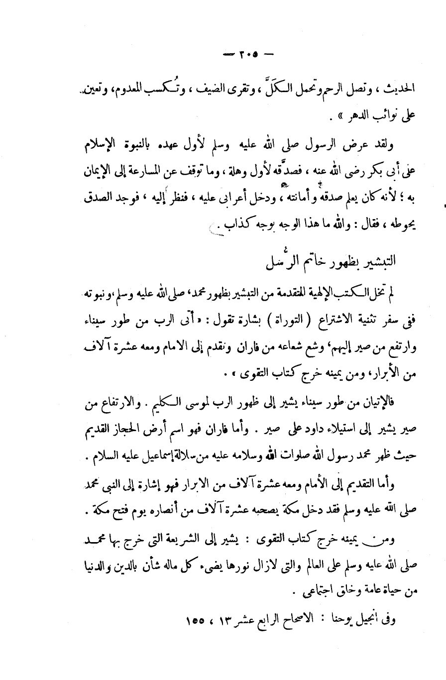 لم تخل الكتب الإلهية المتقدمة من التبشير بظهور محمد صلى الله عليه وسلم ونبوته، ففى سفر تثنية الاشتراع (التوراة) بشارة يقول: " أتى الرب من طور سيناء وارتفع من صير إليهم، وشع شعاعة من فاران، وتقدم إلى الأمام ومعه عشرة آلاف من الأبرار، ومن يمينه خرج كتاب التقوى ".