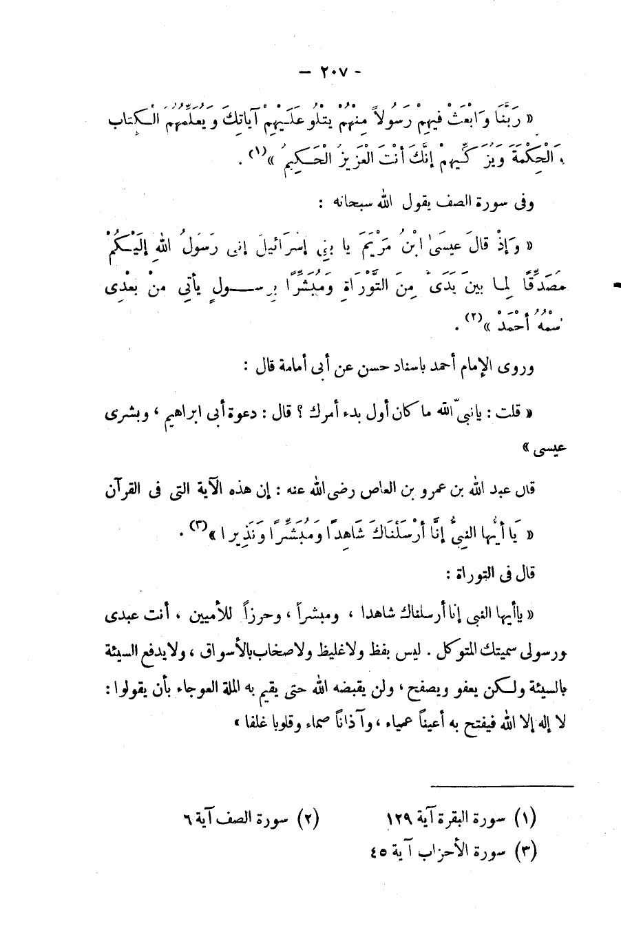 {وَإِذْ قَالَ عِيسَى ابْنُ مَرْيَمَ يَا بَنِي إِسْرائيلَ إِنِّي رَسُولُ اللَّهِ إِلَيْكُمْ مُصَدِّقاً لِمَا بَيْنَ يَدَيَّ مِنَ التَّوْرَاةِ وَمُبَشِّراً بِرَسُولٍ يَأْتِي مِنْ بَعْدِي اسْمُهُ أَحْمَدُ} (¬2).
