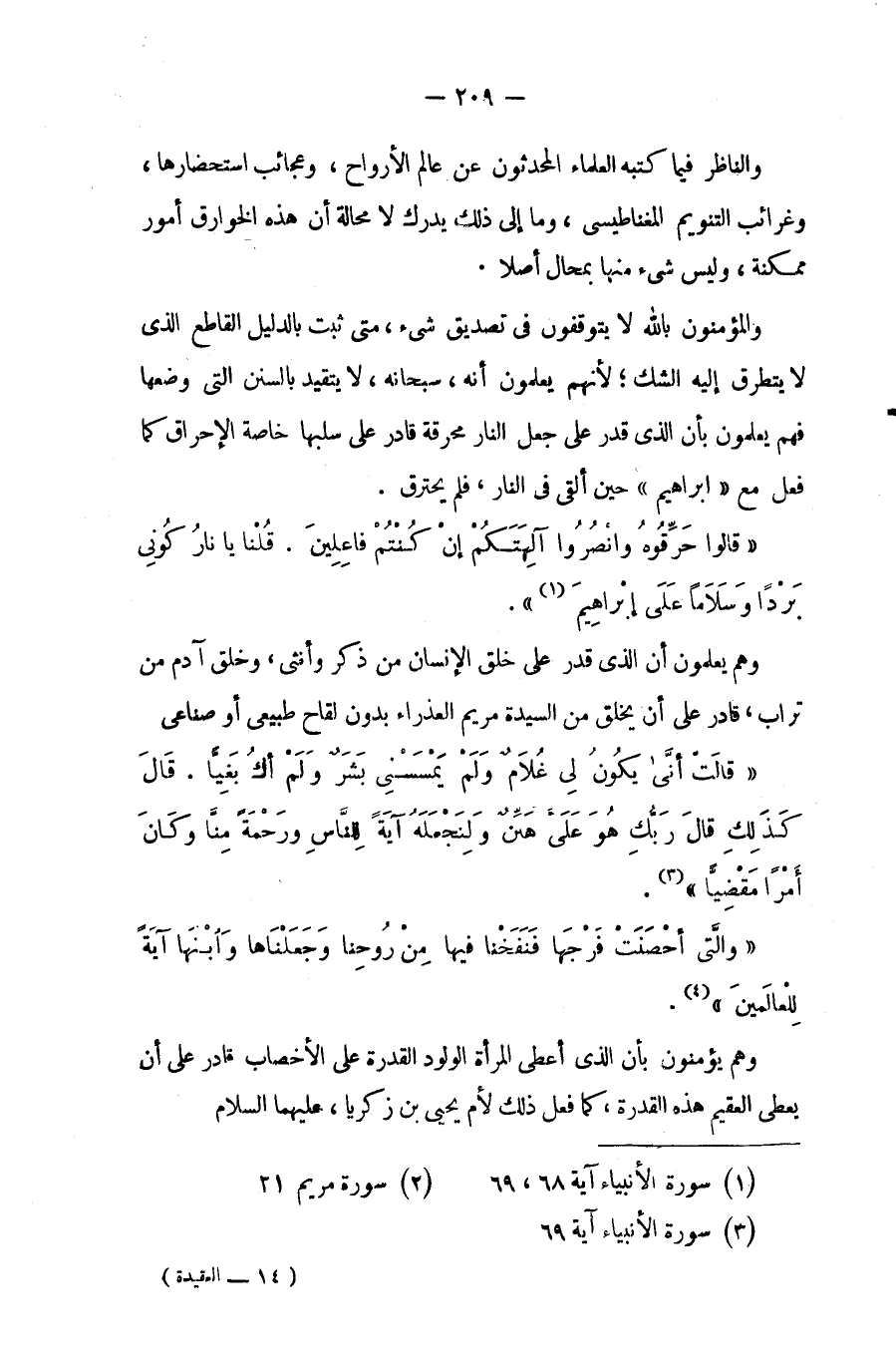 والناظر فيما كتبه العلماء المحدثون عن عالم الأرواح، وعجائب استحضارها، وغرائب التنويم المغناطيسى، وما إلى ذلك يدرك لا محالة أن هذه الخوارق أمور ممكنة، وليس شىء منها بمحال أصلاً.