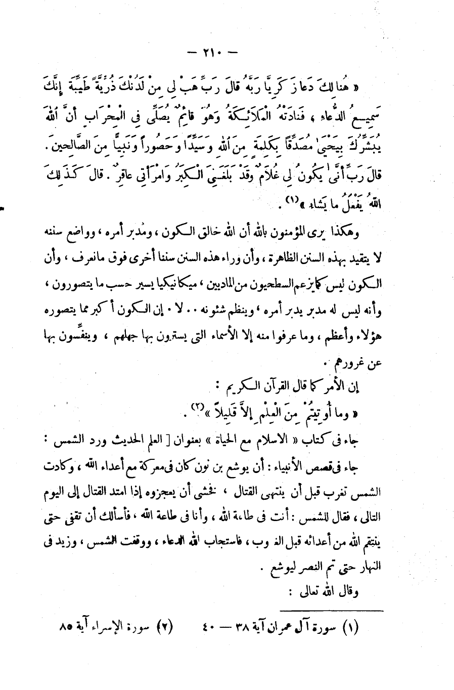 وهكذا يرى المؤمنون بالله أن الله خالق الكون، ومدبر أمره، وواضع سننه لا يتقيد بهذه السنن الظاهرة، وأن وراء هذه السنن سننًا أخرى فوق ما نعرف، وأن الكون ليس كما يزعم السطحيون من الماديين: ميكانيكيًا يسير حسب ما يتصورون، وأنه ليس له مدبر يدبر أمره وينظم شئونه .. لا، إن الكون أكبر مما يتصوره هؤلاء وأعظم، وما عرفوا منه إلا الأسماء التى يسترون بها جهلهم، وينفسون بها عن غرورهم .. وإن الأمر كما قال القرآن الكريم: