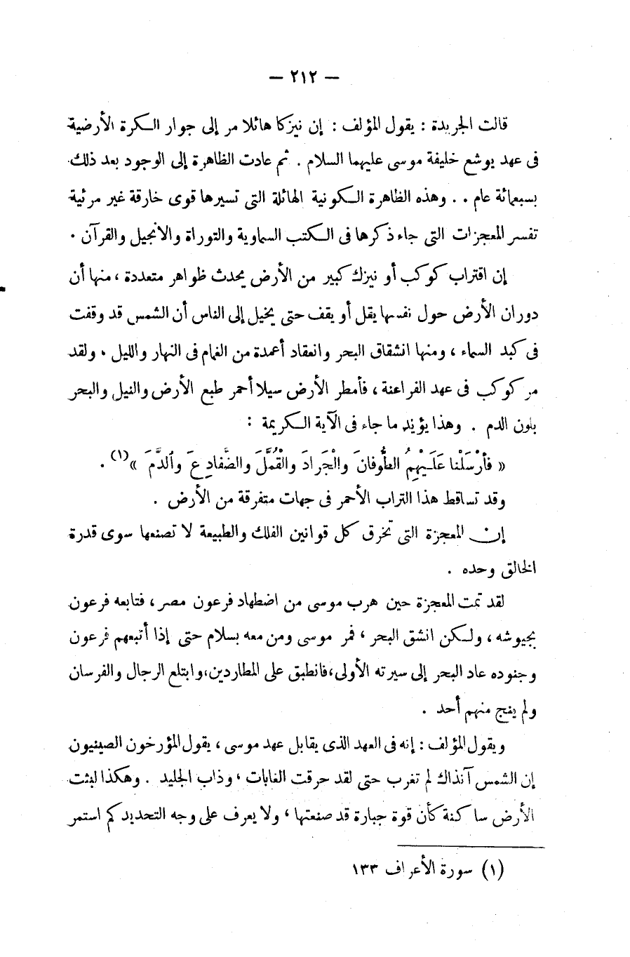 إن اقتراب كوكب أو نيزك كبير من الأرض يحدث ظواهر متعددة، منها أن دوران الأرض حول نفسها يقل أو يقف حتى يخيل إلى الناس أن الشمس قد وقفت فى كبد السماء، ومنها انشقاق البحر، وانعقاد أعمدة من الغمام فى النهار والليل؛ ولقد مر كوكب فى عهد الفراعنة، فأمطر الأرض سيلاً أحمر طبع الأرض والنيل والبحر بلون الدم، وهذا يؤيد ما جاء فى الآية الكريمة: