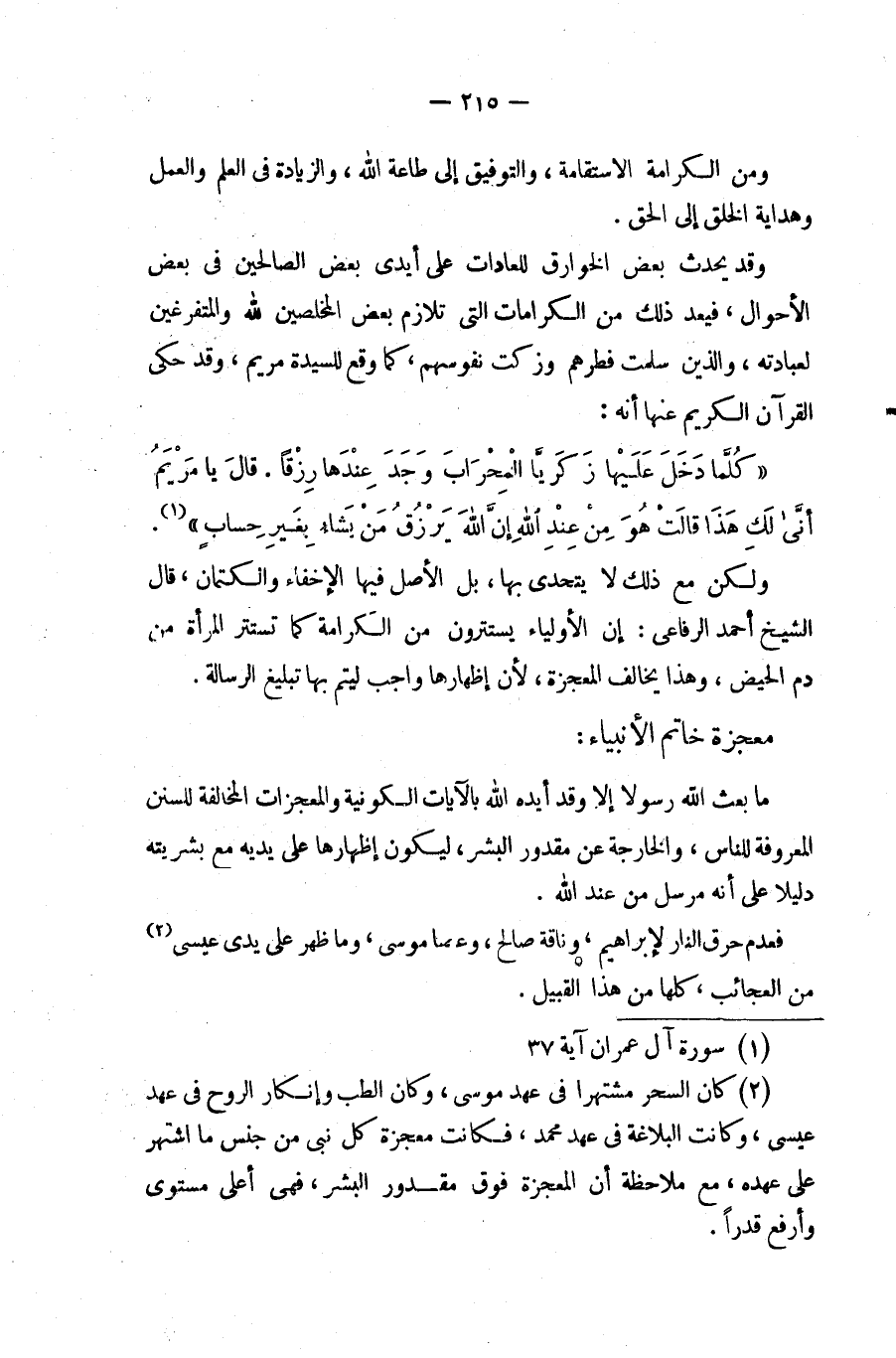 (¬2) كان السحر اشتهر فى عهد موسى - عليه السلام -، وكان طب إنكار الروح فى عهد عيسى - عليه السلام -، وكانت البلاغة فى عهد محمد صلى الله عليه وسلم، فكانت معجزة كل نبى حسب ما اشتهر على عهده، مع ملاحظة أن المعجزة فوق مقدور البشر، فهى أعلى مستوى وأرفع قدرًا.