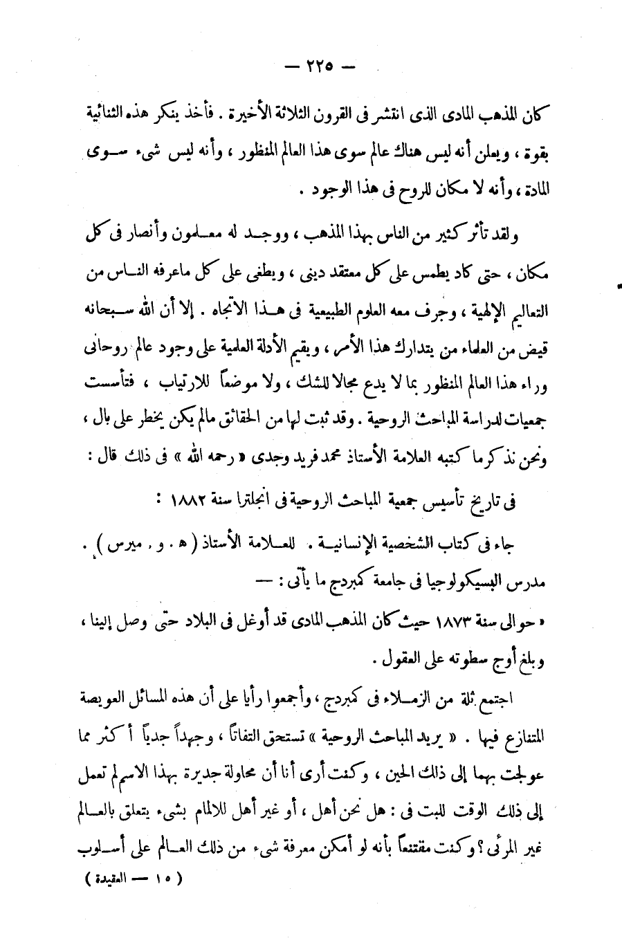 ولقد تأثر كثير من الناس بهذا المذهب، ووجد له معلمون وأنصار فى كل مكان، حتى كاد يطمس على كل معتقد دينى، ويطغى على كل ما عرفه الناس من التعاليم الإلهية، وجرف معه العلوم الطبيعية فى هذا الاتجاه؛ إلا أن الله عز وجل قيض من العلماء من يتدارك هذا الأمر، ويقيم الأدلة العلمية على وجود عالم روحانى وراء هذا العالم المنظور بما لا يدع مجالاً للشك، ولا موضعًا للارتياب، فتأسست جمعيات لدراسة المباحث الروحية، وقد ثبت لها من الحقائق ما لم يكن يخطر على بال، ونحن نذكر ما كتبه العلامة الأستاذ/ محمد فريد وجدى - رحمه الله - فى ذلك قال: