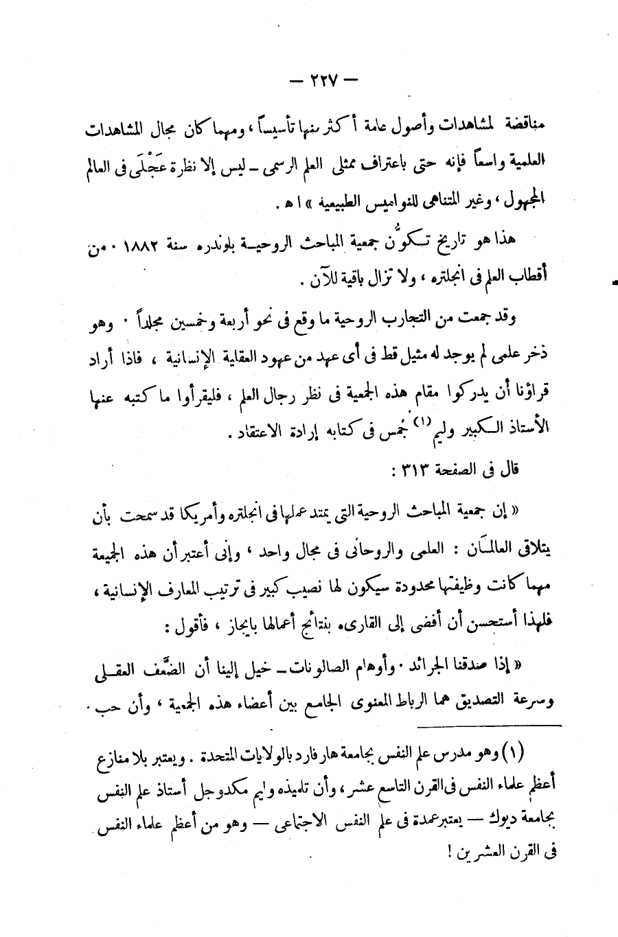 قال فى الصفحة (313): " إن جمعية المباحث الروحية التى يمتد عملها فى إنجلترا وأمريكا قد سمحت بأن يتلاقى العالمان: العلمى والروحانى، فى مجال واحد، وإنى أعتبر أن هذه الجمعية مهما كانت وظيفتها محدودة، سيكون لها نصيب كبير فى ترتيب المعارف الإنسانية، فلهذا أستحسن أن أفضى إلى القارئ بنتائج أعمالها بإيجاز، فأقول: إذا صدقنا الجرائد، وأوهام الصالونات؛ خيل إلينا أن الضعف العقلى وسرعة التصديق، هما الرباط المعنوى الجامع بين أعضاء هذه الجمعية، وأن حب