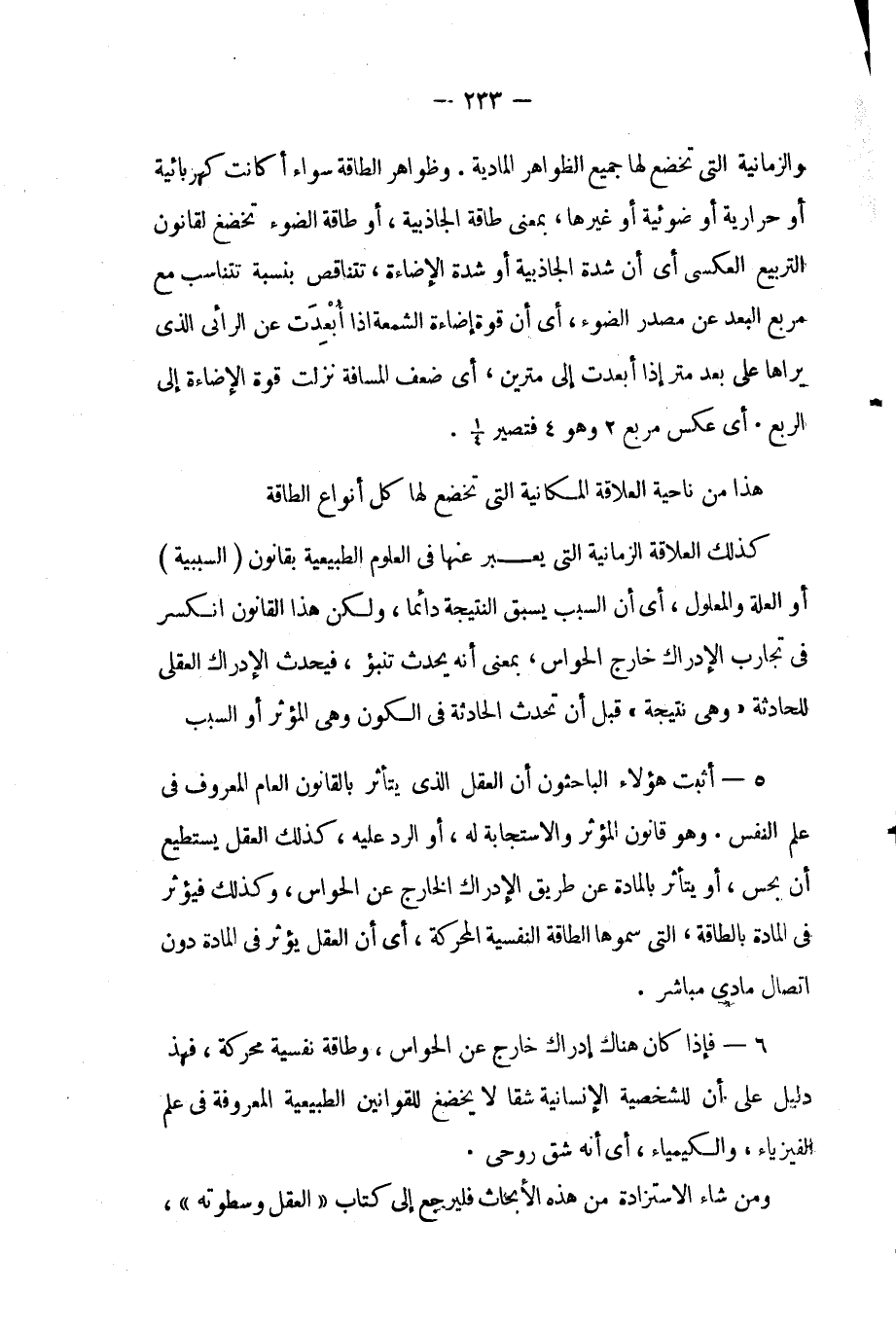 6 - فإذا كان هناك إدراك خارج عن الحواس، وطاقة نفسية محركة، فهذا دليل على أن للشخصية الإنسانية شقًا لا يخضع للقوانين الطبيعية المعروفة فى علم الفيزياء والكيمياء، أى أنه شق روحى.