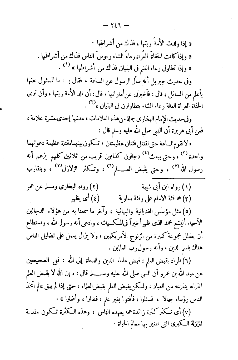 (¬6) المراد بقبض العلم: قبض علماء الدين والدعاة إلى الله، ففى الصحيحين عن عبد الله بن عمرو أن النبى صلى الله عليه وسلم قال: «إن الله لا يقبض العلم انتزاعًا ينتزعه من العباد، ولكن يقبض العلم بقبض العلماء، حتى إذا لم يبق عالم اتخذ الناس رؤسًا جهالاً، فسئلوا، فـ أفتوا بغير علم، فضلوا وأضلوا».