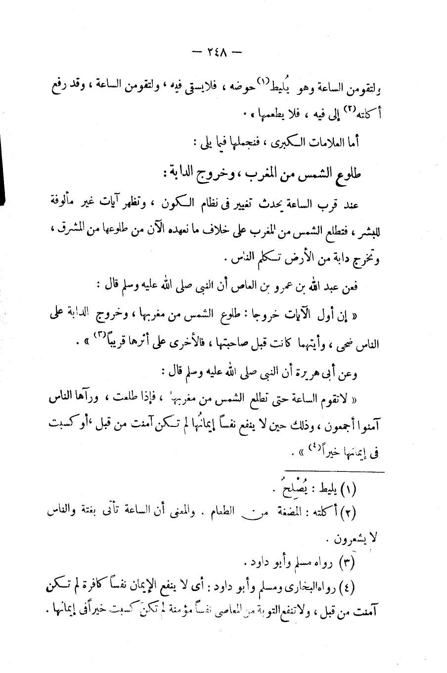 وعن أبى هريرة رضي الله عنه أن النبى صلى الله عليه وسلم قال: «لاَ تَقُومُ السَّاعَةُ حَتَّى تَطْلُعَ الشَّمْسُ مِنْ مَغْرِبِهَا فَإِذَا طَلَعَتْ مِنْ مَغْرِبِهَا آمَنَ النَّاسُ كُلُّهُمْ أَجْمَعُونَ فَيَوْمَئِذٍ لاَ يَنْفَعُ نَفْساً إِيمَانُهَا لَمْ تَكُنْ آمَنَتْ مِنْ قَبْلُ أَوْ كَسَبَتْ فِى إِيمَانِهَا خَيْراً» (¬4).