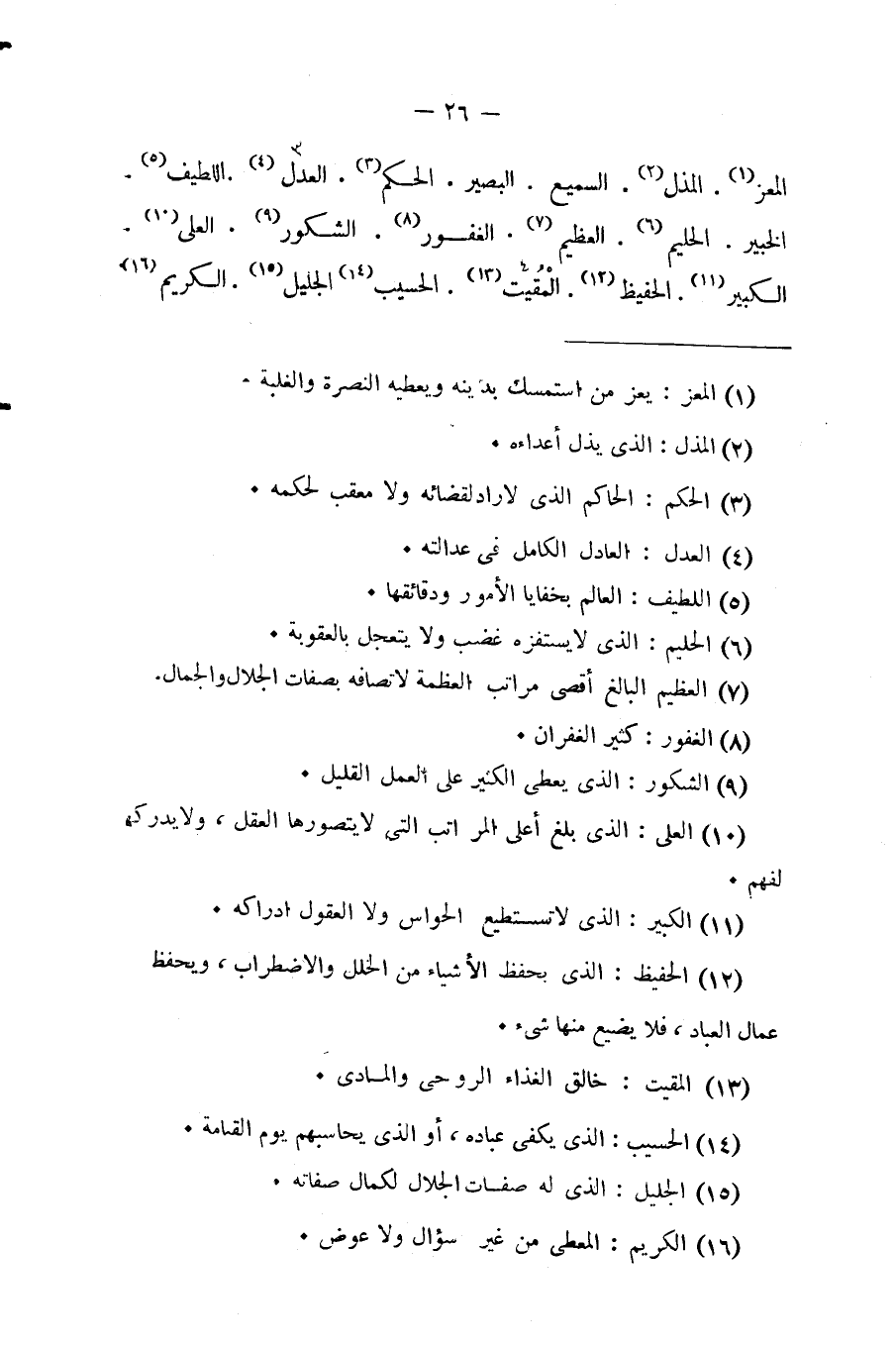 المعز (¬1)؛ المذل (¬2)؛ السميع؛ البصير؛ الحكم (¬3)؛ العدل (¬4)؛ اللطيف (¬5)؛ الخبير؛ الحليم (¬6)؛ العظيم (¬7)؛ الغفور (¬8)؛ الشكور (¬9)؛ العلى (¬10)؛ الكبير (¬11)؛ الحفيظ (¬12)؛ المقيت (¬13)؛ الحسيب (¬14)؛ الجليل (¬15)؛ الكريم (¬16)؛