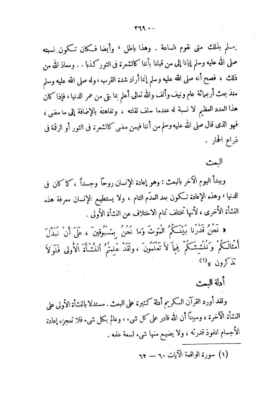 ولقد أورد القرآن الكريم أدلة كثيرة على البعث، مستدلاً بالنشأة الأولى على النشأة الآخرة، ومبينًا أن الله قادر على كل شىء، وعالم بكل شىء، فلا تعجزه إعادة الأجسام لنفوذ قدرته، ولا يضيع منها شىء لسعة علمه.