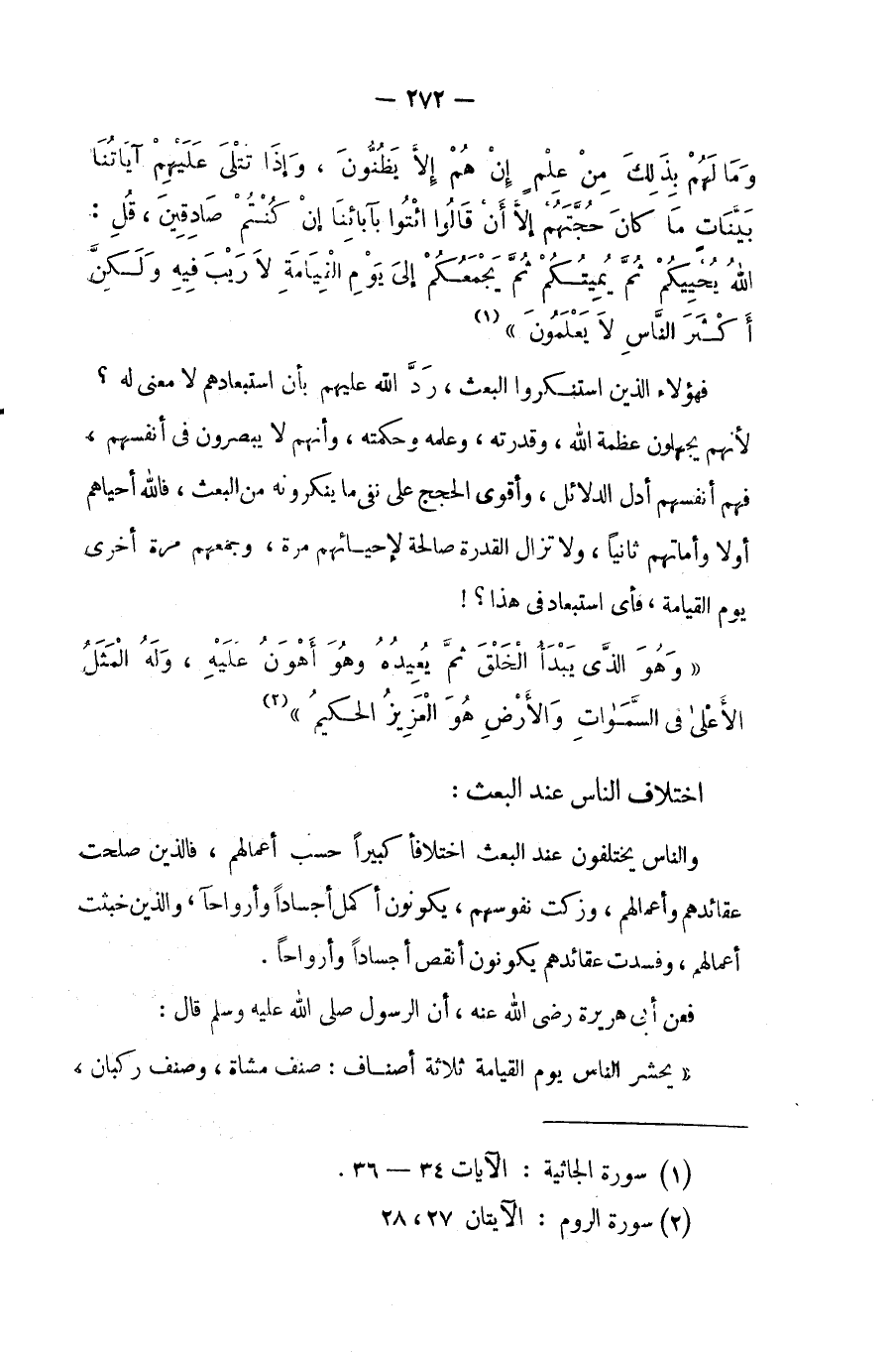 وَمَا لَهُمْ بِذَلِكَ مِنْ عِلْمٍ إِنْ هُمْ إِلاَّ يَظُنُّونَ *وَإِذَا تُتْلَى عَلَيْهِمْ آيَاتُنَا بَيِّنَاتٍ مَا كَانَ حُجَّتَهُمْ إِلاَّ أَنْ قَالُوا ائْتُوا بِآبَائِنَا إِنْ كُنْتُمْ صَادِقِينَ *قُلِ اللَّهُ يُحْيِيكُمْ ثُمَّ يُمِيتُكُمْ ثُمَّ يَجْمَعُكُمْ إِلَى يَوْمِ الْقِيَامَةِ لا رَيْبَ فِيهِ وَلَكِنَّ أَكْثَرَ النَّاسِ لا يَعْلَمُونَ} (¬1).