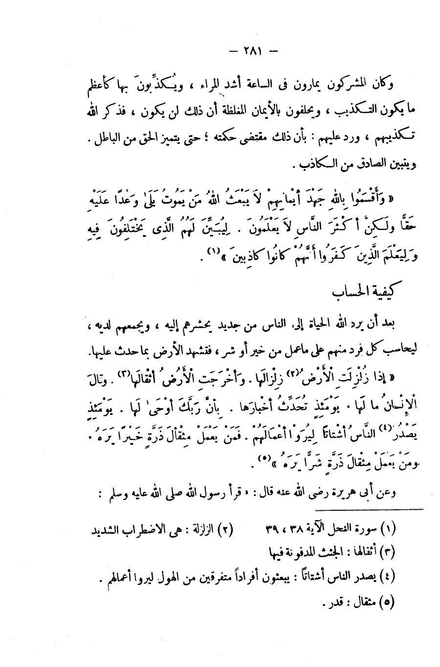{إِذَا زُلْزِلَتِ الأَرْضُ زِلْزَالَهَا (¬2) *وَأَخْرَجَتِ الأَرْضُ أَثْقَالَهَا (¬3) *وَقَالَ الإِنسَانُ مَا لَهَا *يَوْمَئِذٍ تُحَدِّثُ أَخْبَارَهَا *بِأَنَّ رَبَّكَ أَوْحَى لَهَا *يَوْمَئِذٍ يَصْدُرُ (¬4) النَّاسُ أَشْتَاتاً لِّيُرَوْا أَعْمَالَهُمْ *فَمَن يَعْمَلْ مِثْقَالَ ذَرَّةٍ خَيْراً يَرَهُ *وَمَن يَعْمَلْ مِثْقَالَ (¬5) ذَرَّةٍ شَرّاً يَرَهُ} (¬6).