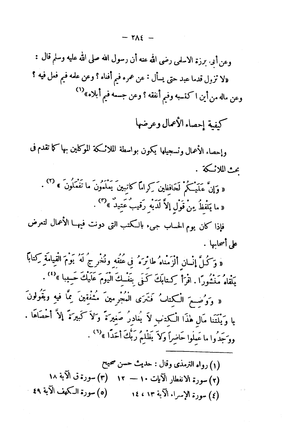 {وَوُضِعَ الْكِتَابُ فَتَرَى الْمُجْرِمِينَ مُشْفِقِينَ مِمَّا فِيهِ وَيَقُولُونَ يَا وَيْلَتَنَا مَالِ هَذَا الْكِتَابِ لا يُغَادِرُ صَغِيرَةً وَلا كَبِيرَةً إِلاَّ أَحْصَاهَا وَوَجَدُوا مَا عَمِلُوا حَاضِراً وَلا يَظْلِمُ رَبُّكَ أَحَداً} (¬5).