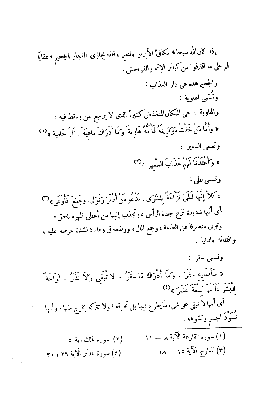 {سَأُصْلِيهِ سَقَرَ *وَمَا أَدْرَاكَ مَا سَقَرُ *لاَ تُبْقِي وَلاَ تَذَرُ *لَوَّاحَةٌ لِّلْبَشَرِ *عَلَيْهَا تِسْعَةَ عَشَرَ} (¬4).