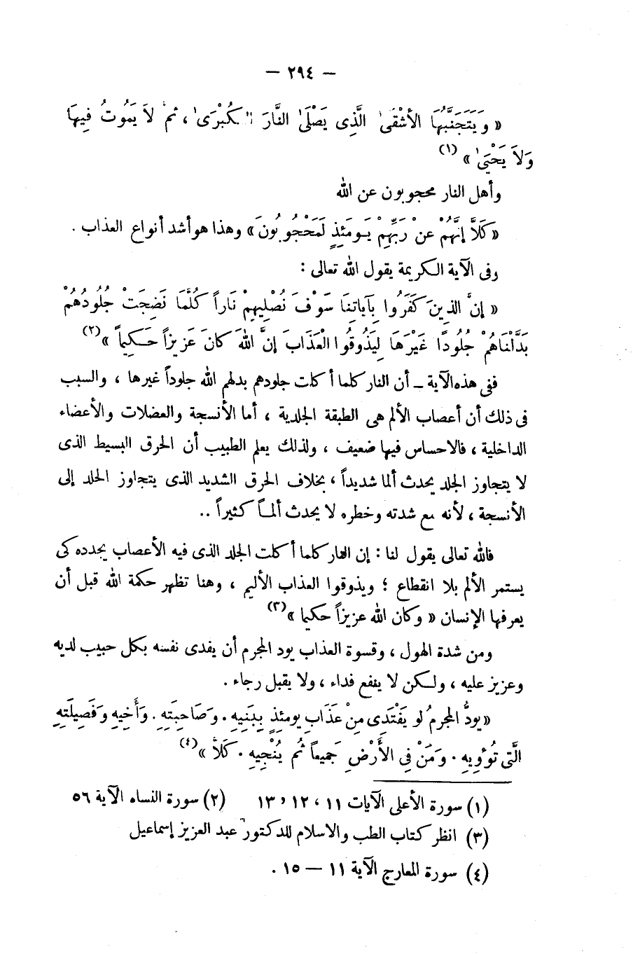 {إِنَّ الَّذِينَ كَفَرُوا بِآيَاتِنَا سَوْفَ نُصْلِيهِمْ نَاراً كُلَّمَا نَضِجَتْ جُلُودُهُمْ بَدَّلْنَاهُمْ جُلُوداً غَيْرَهَا لِيَذُوقُوا الْعَذَابَ إِنَّ اللَّهَ كَانَ عَزِيزاً حَكِيماً} (¬3).