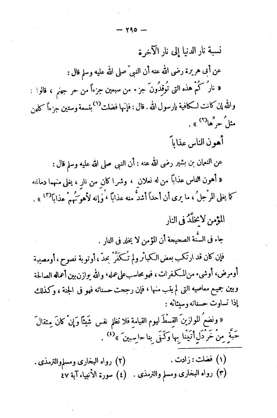 عن أبى هريرة رضي الله عنه، أن النبى صلى الله عليه وسلم قال: «ناركم هذه الذي توقدون جزء من سبعين جزءاً من حر جهنم، قالوا: والله إن كانت لكافية يا رسول الله. قال: فإنها فضلت بتسعة وستين جزءاً كلهن مثل حرها»