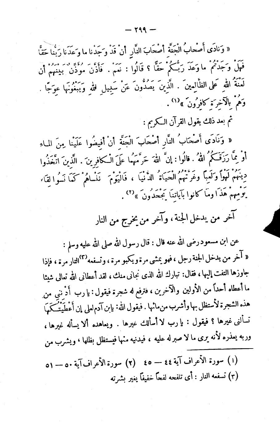 عن ابن مسعود رضي الله عنه قال: قال رسول الله صلى الله عليه وسلم: «آخِرُ مَنْ يَدْخُلُ الْجَنَّةَ رَجُلٌ فَهُوَ يَمْشِى مَرَّةً وَيَكْبُو مَرَّةً وتَسْفَعُهُ (¬3) النَّارُ مَرَّةً فَإِذَا مَا جَاوَزَهَا الْتَفَتَ إِلَيْهَا فَقَالَ تَبَارَكَ الَّذِى نَجَّانِى مِنْكِ لَقَدْ أَعْطَانِىَ اللَّهُ شَيْئاً مَا أَعْطَاهُ أَحَداً مِنَ الأَوَّلِينَ وَالآخِرِينَ. فَتُرْفَعُ لَهُ شَجَرَةٌ فَيَقُولُ أَىْ رَبِّ أَدْنِنِى مِنْ هَذِهِ الشَّجَرَةِ فَلأَسْتَظِلَّ بِظِلِّهَا وَأَشْرَبَ مِنْ مَائِهَا. فَيَقُولُ اللَّهُ عَزَّ وَجَلَّ يَا ابْنَ آدَمَ لَعَلِّى إِنْ أَعْطَيْتُكَهَا سَأَلْتَنِى غَيْرَهَا. فَيَقُولُ لاَ يَا رَبِّ. وَيُعَاهِدُهُ أَنْ لاَ يَسْأَلَهُ غَيْرَهَا وَرَبُّهُ يَعْذِرُهُ لأَنَّهُ يَرَى مَا لاَ صَبْرَ لَهُ عَلَيْهِ فَيُدْنِيهِ مِنْهَا فَيَسْتَظِلُّ بِظِلِّهَا وَيَشْرَبُ مِنْ