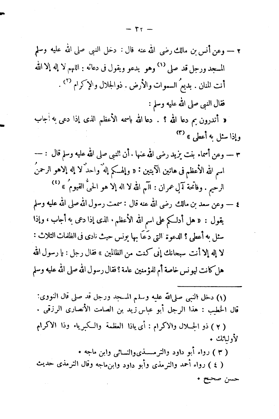 2 - وعن أنس بن مالك رضي الله عنه قال: دخل النبى صلى الله علية وسلم المسجد ورجل قد صلى (¬1) وهو يدعو ويقول فى دعائه: " اللهم لا إله إلا الله أنت المنان، بديع السماوات والأرض، ذو الجلال والإكرام .. فقال النبى صلى الله عليه وسلم: «أتدرون بما دعا الله؟ دعا الله باسمه الأعظم الذى إذا دعى به أجاب، وإذا سئل به أعطى» (¬2).