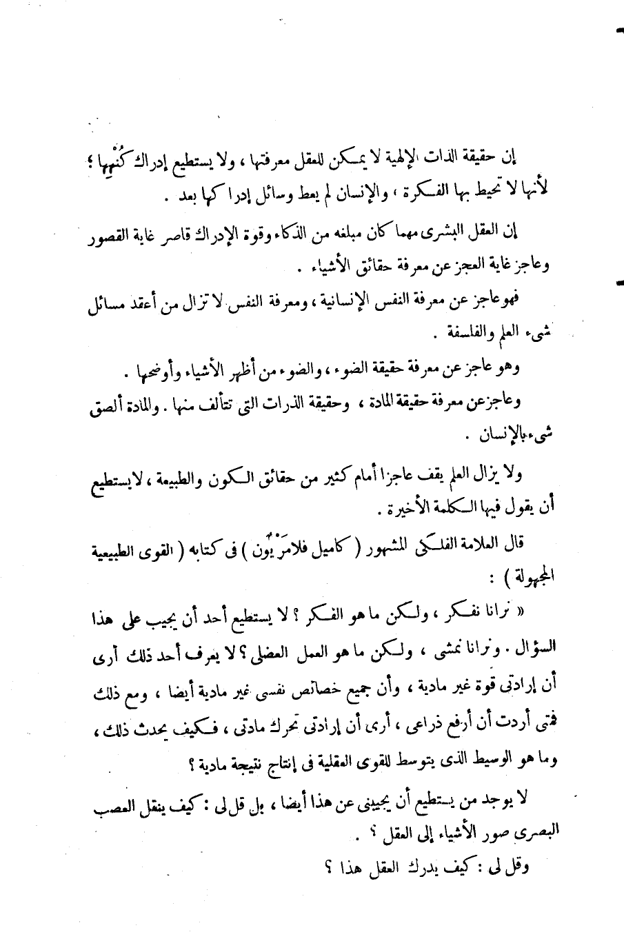 قال العلامة الفلكى المشهور (كاميل فلامَريون) فى كتابه (القوى الطبيعية المجهولة): " نرانا نفكر، ولكن ما هو الفكر؟ لا يستطيع أحد أن يجيب على هذا السؤال؛ ونرانا نمشى، ولكن ما هو العمل العضلى؟ لا يعرف أحد ذلك .. أرى أن إرادتى قوة غير مادية، وأن جميع خصائص نفسى غير مادية أيضًا .. ومع ذلك فمتى أردت أن أرفع ذراعى، أرى أن إرادتى تحرك مادتى، فكيف يحدث ذلك؟ وما هو الوسيط الذى يتوسط للقوى العقلية فى إنتاج نتيجة مادية؟ يوجد من يستطيع أن يجيبنى عن هذا أيضًا؟ بل قل لى: كيف ينقل العصب البصرى صور الأشياء على العقل؟ وقل لى: كيف يدرك العقل هذا؟
