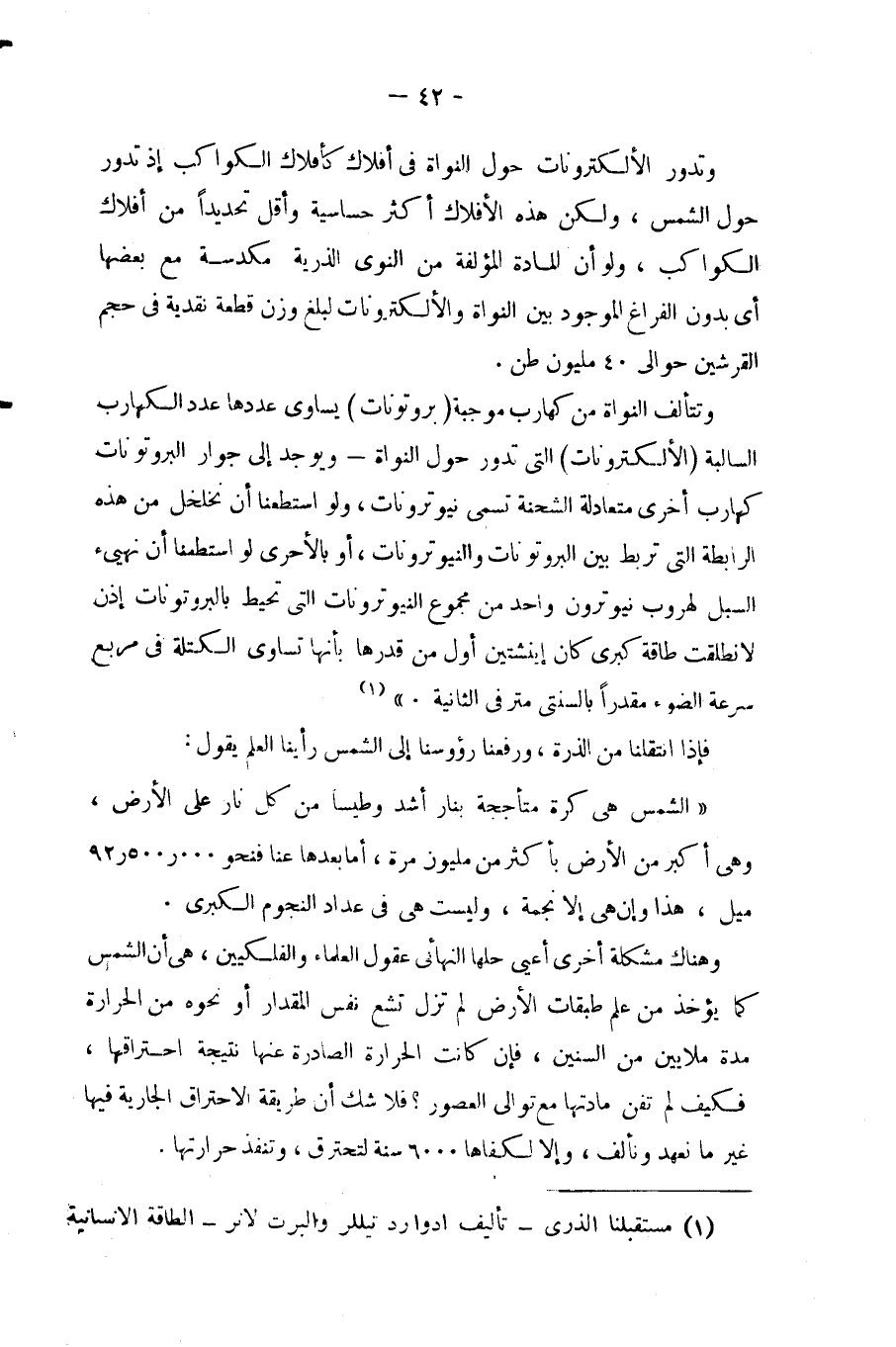 وتتألف النواة من كهارب موجبة (بروتونات) يساوى عددهم عدد الكهارب السالبة (الإلكترونات) التى تدور حول النواة .. ويجد إلى جوار البروتونات كهارب أخرى متعادلة الشحنة تسمى نيوترونات، ولو استطعنا أن نخلخل من هذه الرابطة التى تربط بين البروتونات والنيوترونات، ولو استطعنا أن نخلخل من هذه الرابطة التى تربط بين البروتونات والنيوترونات، أو بالأحرى لو استطعنا أن نهيئ السبل لهروب نيترون واحد من مجموع النيوترونات التى تحيط بالبروتونات إذن لانطلقت طاقة كبرى كان (أينشتين) أول من قدرها بأنها تساوى الكتلة فى مربع سرعة الضوء مقدرًا بالسنتيمتر فى الثانية " (¬1).