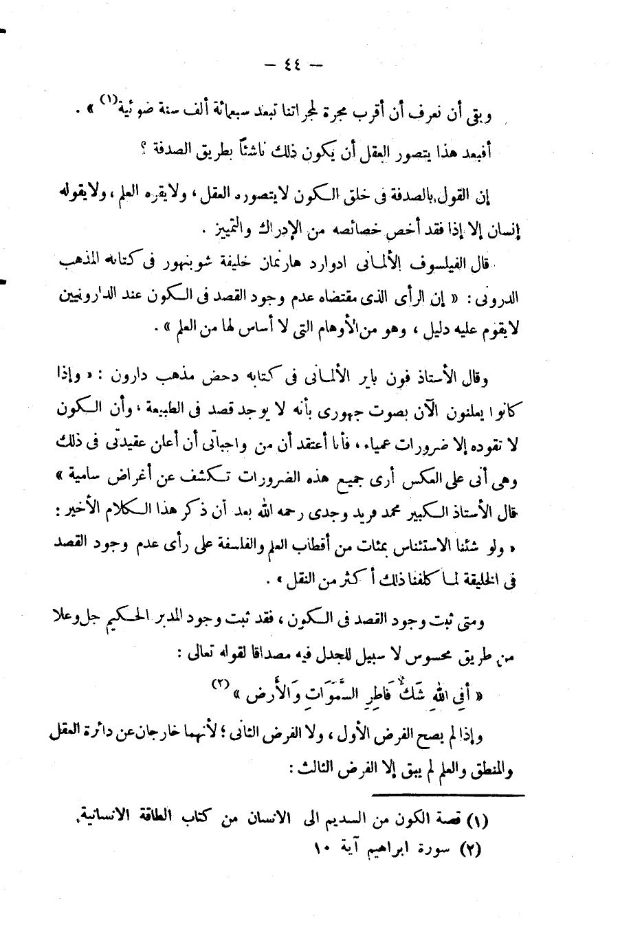 وقال الأستاذ (فون باير) الألمانى فى كتابه (دحض مذهب دارون): " وإذا كانوا يعلنون الآن بصوت جهورى بأنه لا يوجد قصد فى الطبيعة، وأن الكون لا تقوده إلا ضرورات عمياء، فأنا أعتقد أن من واجباتى أن أعلن عقيدتى فى ذلك، وهى أنى - على العكس - أرى جميع هذه الضرورات تكشف عن أغراض سامية " .. قال الأستاذ الكبير (محمد فريد وجدى) - رحمه الله - بعد أن ذكر هذا الكلام الأخير: " ولو شئنا الاستئناس بمئات من أقطاب العلم والفلسفة على رأى عدم وجود القصد فى الخليقة، لما كلفنا ذلك أكثر من النقل ".